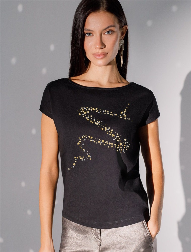 Плотность: 170 Г/м2 Футболка черного цвета идеально подходит для вечеринки и создания яркого образа. Оригинальный блестящий принт из устойчивой фольги в виде новогоднего символа змеи золотистого цвета придает изделию шикарный вид, который привлечет внимание на любом мероприятии. Модель с вырезом лодочка и цельнокроеным коротким рукавом обеспечивает свободу движений и комфорт в носке. Такой фасон изделия подходит на большие размеры, гармонично сидит на фигуре и помогает создать легкий акцент на достоинствах. Аккуратный вырез лодочка красиво подчеркивает шею и делает образ элегантным, сохраняя актуальность для разных случаев — от рабочих встреч до вечерних прогулок и праздничных мероприятий. Модель изготовлена из премиального хлопка с добавлением эластана. Добавление эластана в состав изделия способствует формоустойчивости. Эта нарядная футболка подходит для создания образа на каждый день и идеально подойдет на выход. Модель не мнется, что делает ее практичным вариантом для активных женщин, которые ценят стиль и удобство. Женская футболка подчеркнет вашу индивидуальность и позволит вам выглядеть привлекательно в любой ситуации. Легкость в уходе и высокая износостойкость делают ее незаменимой вещью в вашем гардеробе. Благодаря сочному дизайну и качественной отделке, футболка легко сочетается с различными элементами гардероба, позволяя создавать уникальные комплекты для разных случаев. Она станет ярким акцентом в вашем гардеробе и подарит уверенность на любом событии. Такой вариант одежды станет отличной базой для стильного и эффектного образа на праздничное событие, корпоратив, Новый Год. Комментарии к товару
