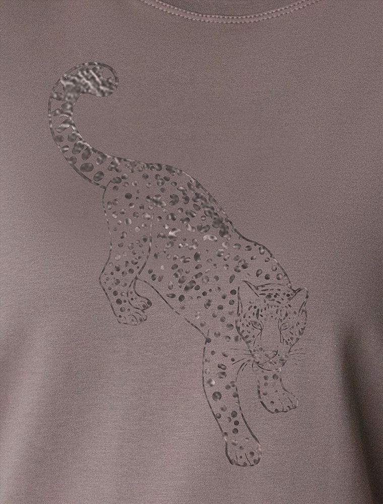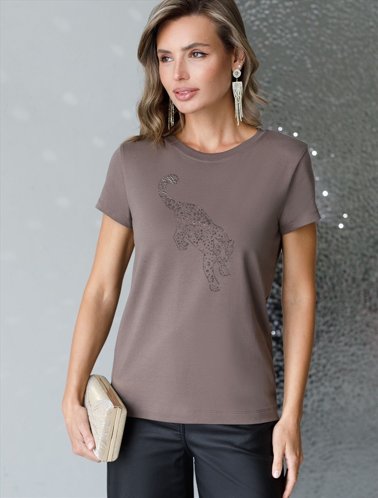 Плотность: 170 Г/м2 Стильная базовая футболка кофейного цвета с серебристым принтом фольгой выполнена из плотного хлопка с эластаном для комфортной посадки на любую фигуру. Прямая футболка классического кроя с круглым вырезом, прекрасно подходит для разных типов фигуры, в том числе и на большие размеры. Мягкость хлопка вместе с небольшой долей эластана гарантирует идеальную посадку и свободу движений. Легкая натуральная дышащая ткань премиального качества делает футболку с коротким рукавом идеальным вариантом для повседневной носки дома, на работу или офис. Однотонная футболка дополнена авторским аккуратным принтом с изображением леопарда, который придает праздничный и элегантный вид без лишней вычурности. Блестящий анималистичный принт аккуратно украшает, добавляя изысканный акцент и создавая легкий мерцающий эффект. Эта эффектная футболка станет отличным выбором на праздник, подчеркивая образ сияющей и уверенной в себе девушки или женщины. Если вы ищете комфортный и одновременно привлекательный наряд для особых моментов, эта футболка станет надежным решением, подчеркивающим вашу индивидуальность и вкус. Комментарии к товару