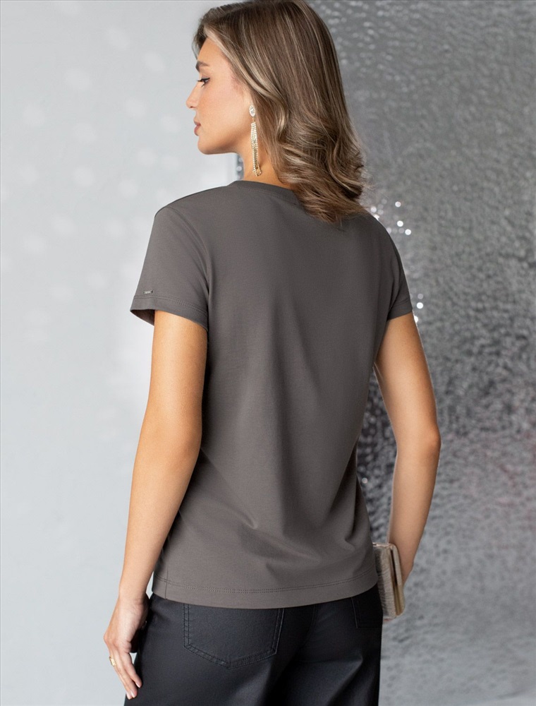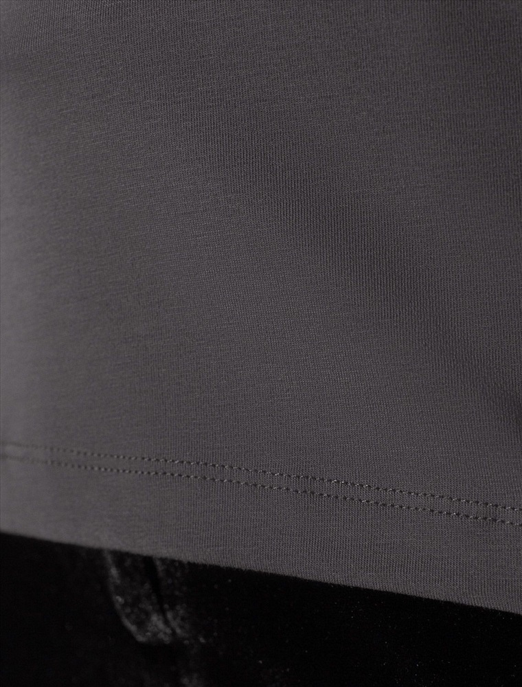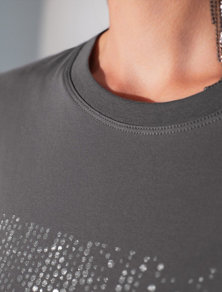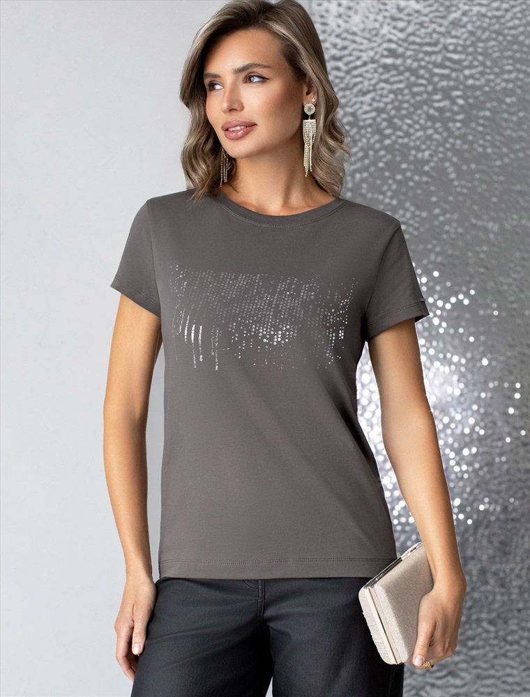 Стильная базовая футболка темно-серого цвета с серебристым принтом устойчивами красками выполнена из плотного хлопка с эластаном для комфортной посадки на любую фигуру. Прямая футболка классического кроя с круглым вырезом, прекрасно подходит для разных типов фигуры, в том числе и на большие размеры. Мягкость хлопка вместе с небольшой долей эластана гарантирует идеальную посадку и свободу движений. Легкая натуральная дышащая ткань премиального качества делает футболку с коротким рукавом идеальным вариантом для повседневной носки дома, на работу или офис. Однотонная футболка дополнена авторским аккуратным принтом, который придает праздничный и элегантный вид без лишней вычурности. Блестящий принт в виде дождика аккуратно украшает, добавляя изысканный акцент и создавая легкий мерцающий эффект.