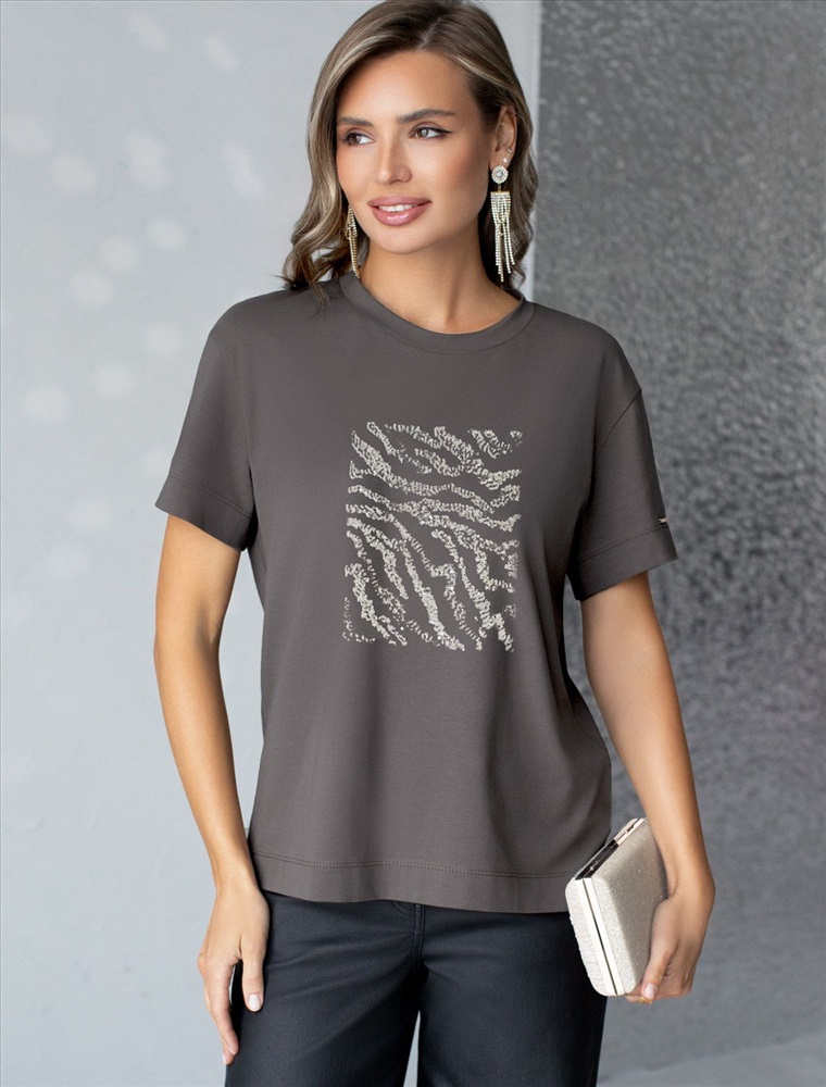 Плотность: 170 Г/м2 Стильная базовая футболка темно-серого цвета с серебристым принтом пайетками выполнена из плотного хлопка с эластаном для комфортной посадки на любую фигуру. Прямая футболка классического кроя с круглым вырезом, прекрасно подходит для разных типов фигуры, в том числе и на большие размеры. Мягкость хлопка вместе с небольшой долей эластана гарантирует идеальную посадку и свободу движений. Легкая натуральная дышащая ткань премиального качества делает футболку с коротким рукавом идеальным вариантом для повседневной носки дома, на работу или офис. Однотонная футболка дополнена авторским аккуратным принтом зебра, который придает праздничный и элегантный вид без лишней вычурности. Блестящий анималистичный принт аккуратно украшает, добавляя изысканный акцент и создавая легкий мерцающий эффект. Эта эффектная футболка станет отличным выбором на праздник, подчеркивая образ сияющей и уверенной в себе девушки или женщины. Если вы ищете комфортный и одновременно привлекательный наряд для особых моментов, эта футболка станет надежным решением, подчеркивающим вашу индивидуальность и вкус. Комментарии к товару