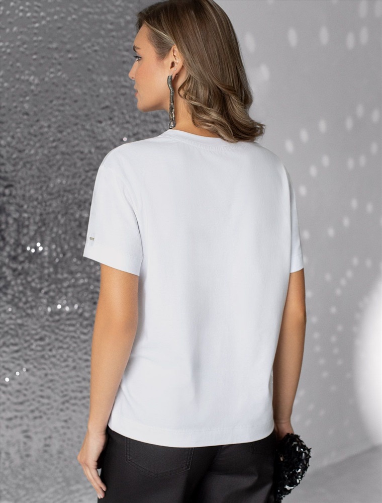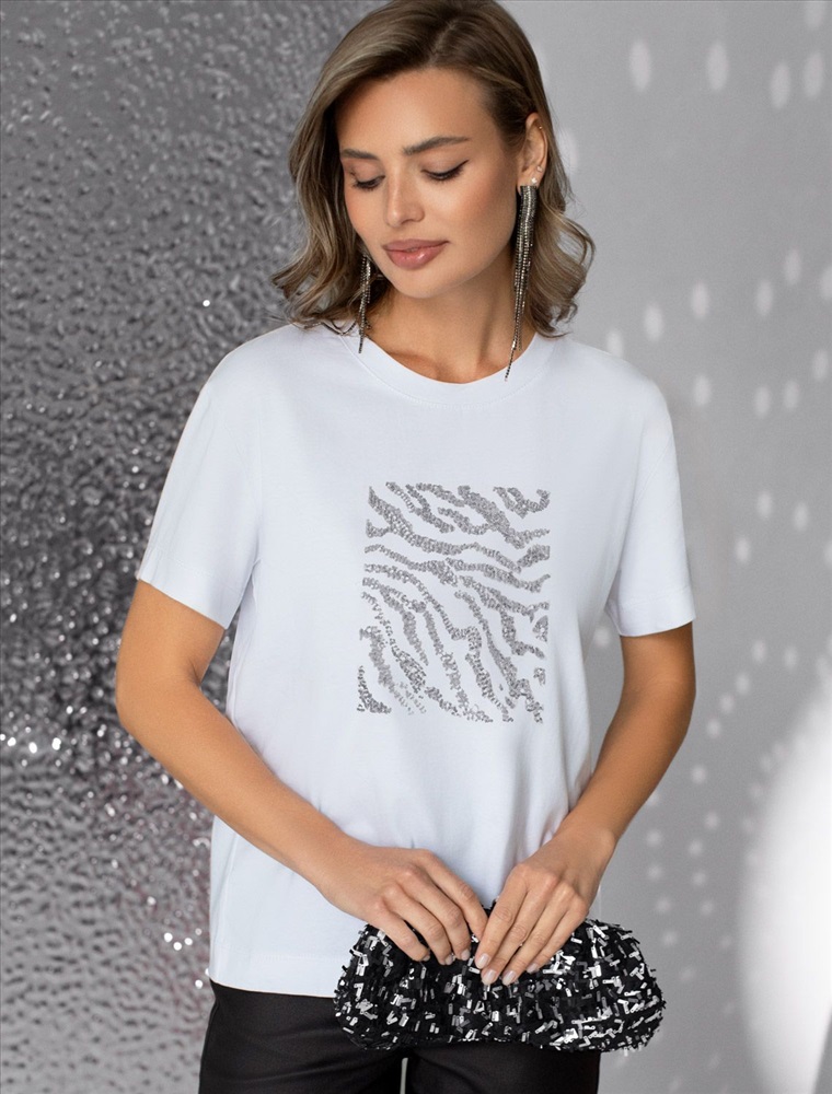 Плотность: 170 Г/м2 Стильная базовая футболка белого цвета с серебристым принтом пайетками выполнена из плотного хлопка с эластаном для комфортной посадки на любую фигуру. Прямая футболка классического кроя с круглым вырезом, прекрасно подходит для разных типов фигуры, в том числе и на большие размеры. Мягкость хлопка вместе с небольшой долей эластана гарантирует идеальную посадку и свободу движений. Легкая натуральная дышащая ткань премиального качества делает футболку с коротким рукавом идеальным вариантом для повседневной носки дома, на работу или офис. Однотонная футболка дополнена авторским аккуратным принтом зебра, который придает праздничный и элегантный вид без лишней вычурности. Блестящий анималистичный принт аккуратно украшает, добавляя изысканный акцент и создавая легкий мерцающий эффект. Эта эффектная футболка станет отличным выбором на праздник, подчеркивая образ сияющей и уверенной в себе девушки или женщины. Если вы ищете комфортный и одновременно привлекательный наряд для особых моментов, эта футболка станет надежным решением, подчеркивающим вашу индивидуальность и вкус. Комментарии к товару