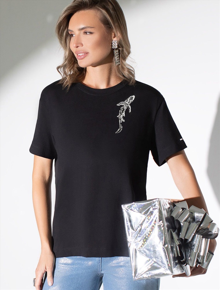 Плотность: 170 Г/м2 Стильная базовая футболка черного цвета с принтом пайетками в виде рыбки выполнена из плотного хлопка с эластаном для комфортной посадки на любую фигуру. Прямая футболка классического кроя с круглым вырезом, прекрасно подходит для разных типов фигуры, в том числе и на большие размеры. Мягкость хлопка вместе с небольшой долей эластана гарантирует идеальную посадку и свободу движений. Легкая натуральная дышащая ткань премиального качества делает футболку с коротким рукавом идеальным вариантом для повседневной носки дома, на работу или офис. Однотонная футболка дополнена авторским аккуратным принтом зебра, который придает праздничный и элегантный вид без лишней вычурности. Блестящий анималистичный принт аккуратно украшает, добавляя изысканный акцент и создавая легкий мерцающий эффект. Эта эффектная футболка станет отличным выбором на праздник, подчеркивая образ сияющей и уверенной в себе девушки или женщины. Если вы ищете комфортный и одновременно привлекательный наряд для особых моментов, эта футболка станет надежным решением, подчеркивающим вашу индивидуальность и вкус. Комментарии к товару