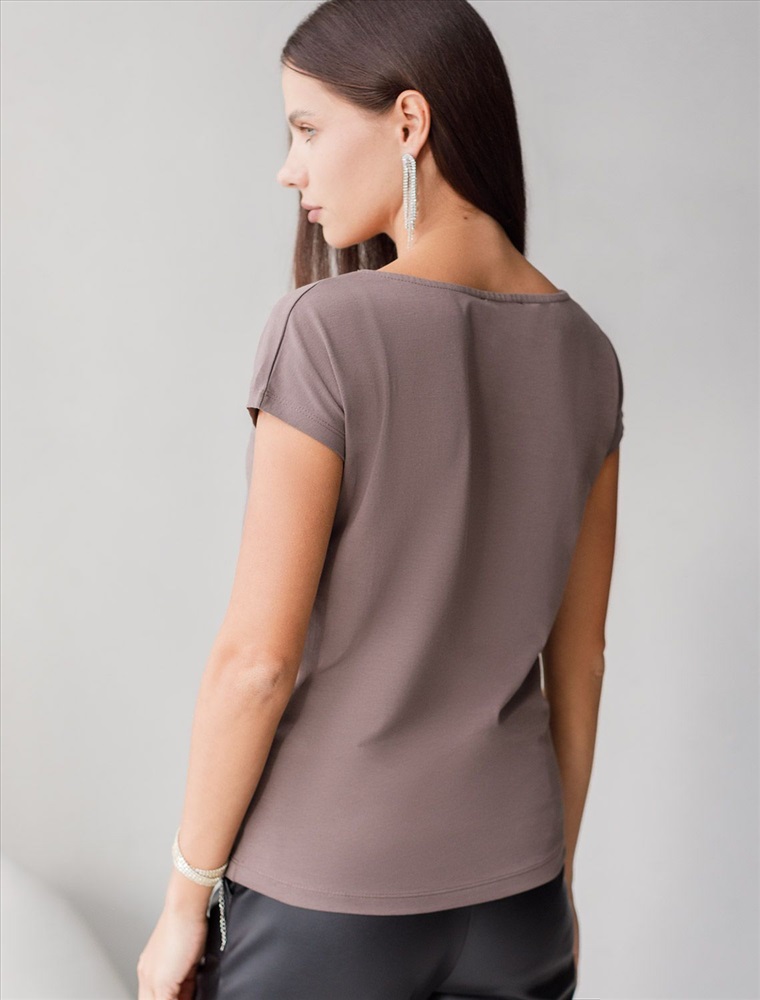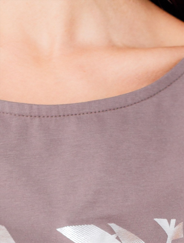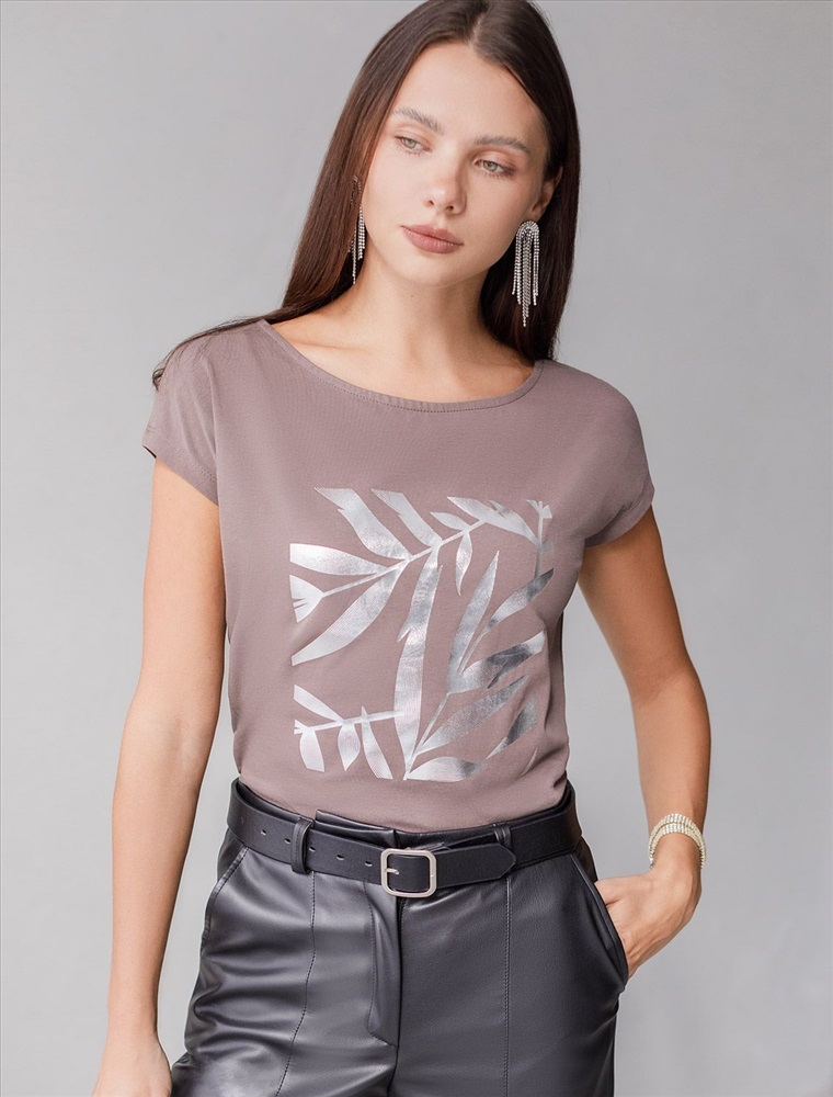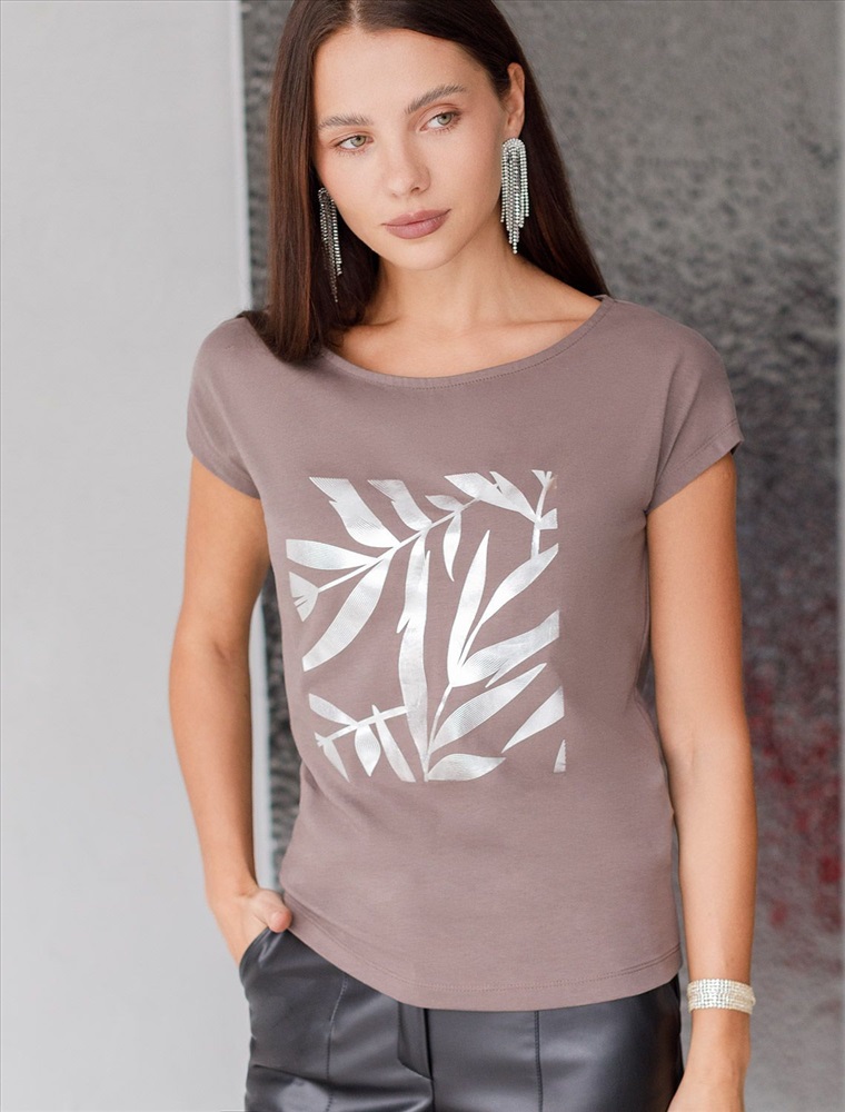Плотность: 150 Г/м2 Футболка кофейного цвета идеально подходит для вечеринки и создания яркого образа. Оригинальный блестящий принт из устойчивой фольги в виде серебристых листиков придает изделию шикарный вид, который привлечет внимание на любом мероприятии. Модель с вырезом лодочка и цельнокроеным коротким рукавом обеспечивает свободу движений и комфорт в носке. Такой фасон изделия подходит на большие размеры, гармонично сидит на фигуре и помогает создать легкий акцент на достоинствах. Аккуратный вырез лодочка красиво подчеркивает шею и делает образ элегантным, сохраняя актуальность для разных случаев — от рабочих встреч до вечерних прогулок и праздничных мероприятий. Модель изготовлена из премиального хлопка с добавлением эластана. Добавление эластана в состав изделия способствует формоустойчивости. Эта нарядная футболка подходит для создания образа на каждый день и идеально подойдет на выход. Модель не мнется, что делает ее практичным вариантом для активных женщин, которые ценят стиль и удобство. Женская футболка подчеркнет вашу индивидуальность и позволит вам выглядеть привлекательно в любой ситуации. Легкость в уходе и высокая износостойкость делают ее незаменимой вещью в вашем гардеробе. Благодаря сочному дизайну и качественной отделке, футболка легко сочетается с различными элементами гардероба, позволяя создавать уникальные комплекты для разных случаев. Она станет ярким акцентом в вашем гардеробе и подарит уверенность на любом событии. Такой вариант одежды станет отличной базой для стильного и эффектного образа на праздничное событие, корпоратив, Новый Год. Комментарии к товару