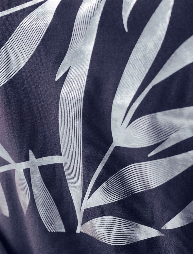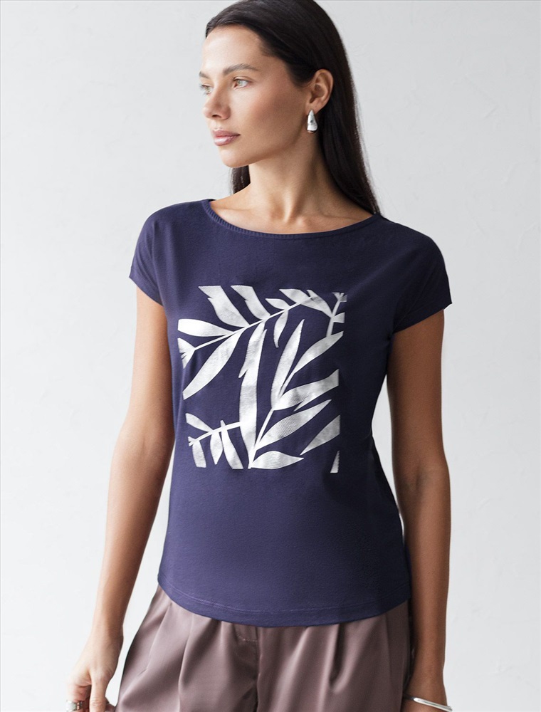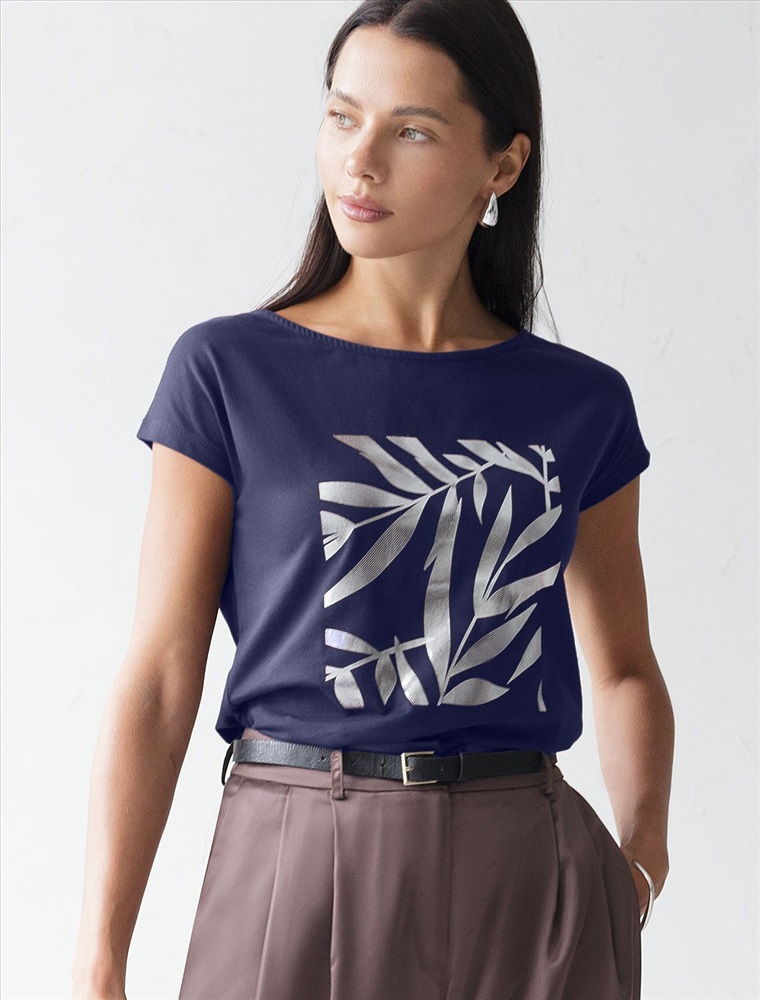 Плотность: 150 Г/м2 Футболка темно-синего цвета идеально подходит для вечеринки и создания яркого образа. Оригинальный блестящий принт из фольги серебристого цвета в виде листиков придает изделию шикарный вид, который привлечет внимание на любом мероприятии. Модель с вырезом лодочка и цельнокроеным коротким рукавом обеспечивает свободу движений и комфорт в носке. Такой фасон изделия подходит на большие размеры, гармонично сидит на фигуре и помогает создать легкий акцент на достоинствах. Аккуратный вырез лодочка красиво подчеркивает шею и делает образ элегантным, сохраняя актуальность для разных случаев — от рабочих встреч до вечерних прогулок и праздничных мероприятий. Модель изготовлена из премиального хлопка с добавлением эластана. Добавление эластана в состав изделия способствует формоустойчивости. Эта нарядная футболка подходит для создания образа на каждый день и идеально подойдет на выход. Модель не мнется, что делает ее практичным вариантом для активных женщин, которые ценят стиль и удобство. Женская футболка подчеркнет вашу индивидуальность и позволит вам выглядеть привлекательно в любой ситуации. Легкость в уходе и высокая износостойкость делают ее незаменимой вещью в вашем гардеробе. Благодаря сочному дизайну и качественной отделке, футболка легко сочетается с различными элементами гардероба, позволяя создавать уникальные комплекты для разных случаев. Она станет ярким акцентом в вашем гардеробе и подарит уверенность на любом событии. Такой вариант одежды станет отличной базой для стильного и эффектного образа на праздничное событие, корпоратив, Новый Год. Комментарии к товару
