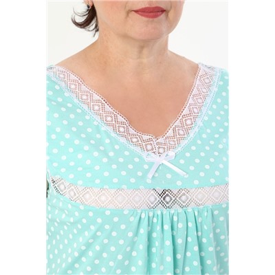 Артикул: НФ-00022768 Цвет: бирюзовый Для: Женщин Состав материала: 100% Хлопок Плотность материала: 145 г/м2 Материал: Кулирка Бренд: Текс-плюс Вид изделия: Ночные сорочки Код товара: НФ-00022768 Ночная сорочка женская свободного силуэта из трикотажного полотна длиной ниже уровня колена. На полочке присутствует кокетка, по линии которой выполнена строчка с отделочным кружевом. Вырез горловины V- образный. Комментарии к товару