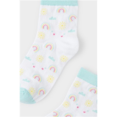 Короткие трикотажные носки для девочки. Эластичная резинка по верхнему краю. Украшены рисунком с изображением радуги и солнышек.