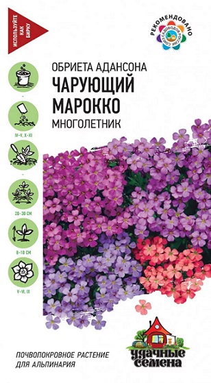 Крупноцветковая обриета -многолетнее растение, образующее распростертые куртинки до 8-10 см высотой, зимующие под снегом. Цветки до 1,5 см, разнообразной окраски. Цветет в мае -июне, осенью наблюдается повторное цветение. Месторасположение только солнечное, даже в полутени обриета вытягивается и практически не цветет. Обриета предпочитает легкие, не слишком плодородные, некислые почвы. После майского цветения растения сразу обрезают, что способствует быстрому и более компактному росту. Отлично подойдет для создания альпинария. Фасовка 0,05г Комментарии к товару