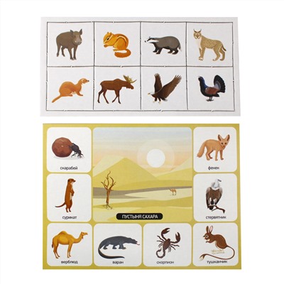 Каждая большая карточка посвящена определенной природной зоне - смешанный лес, степь, тайга тундра, пустыня, арктика. Малые карточки разделены на тематические группы животных и птиц по видам обитания в природных зонах.