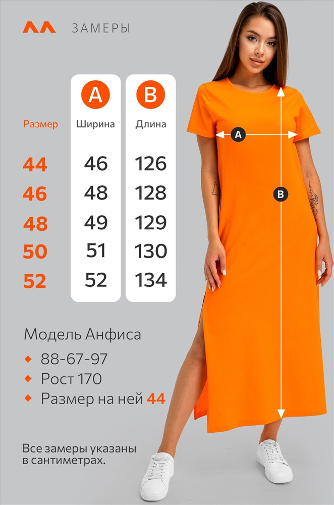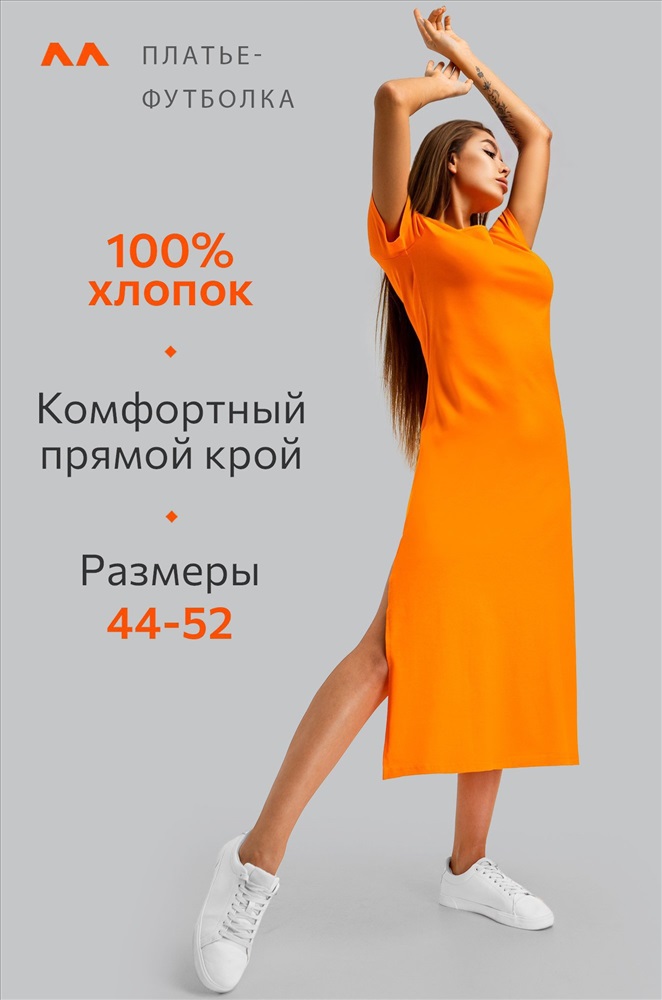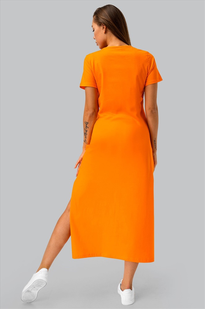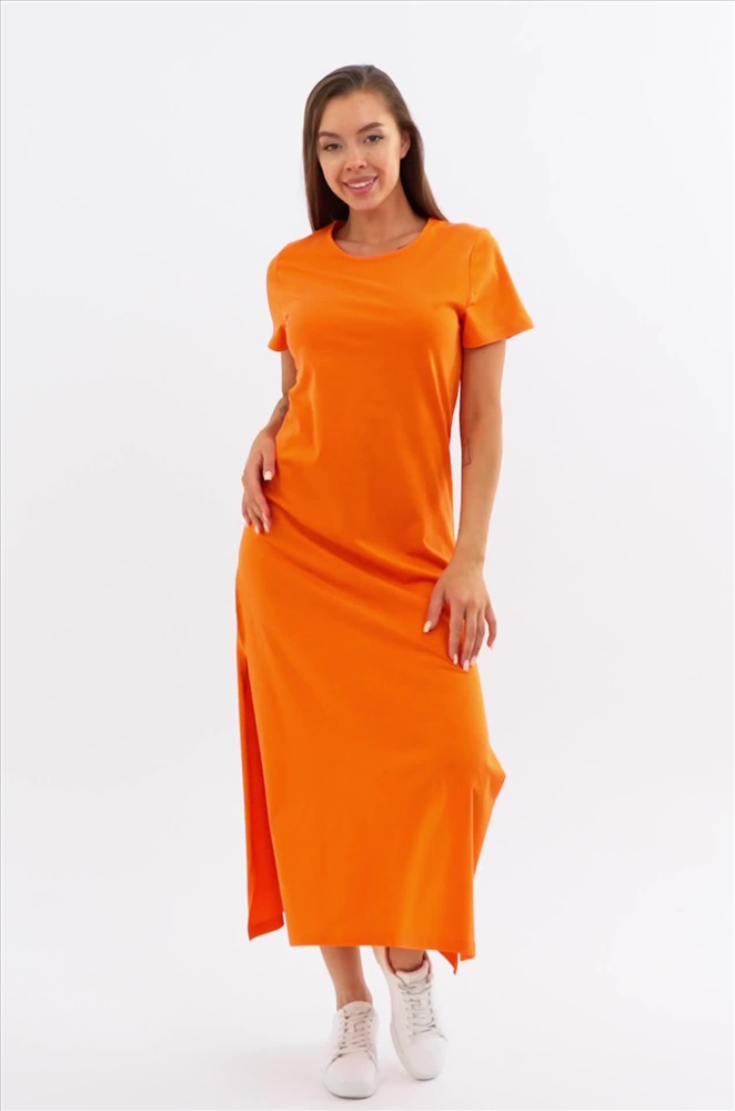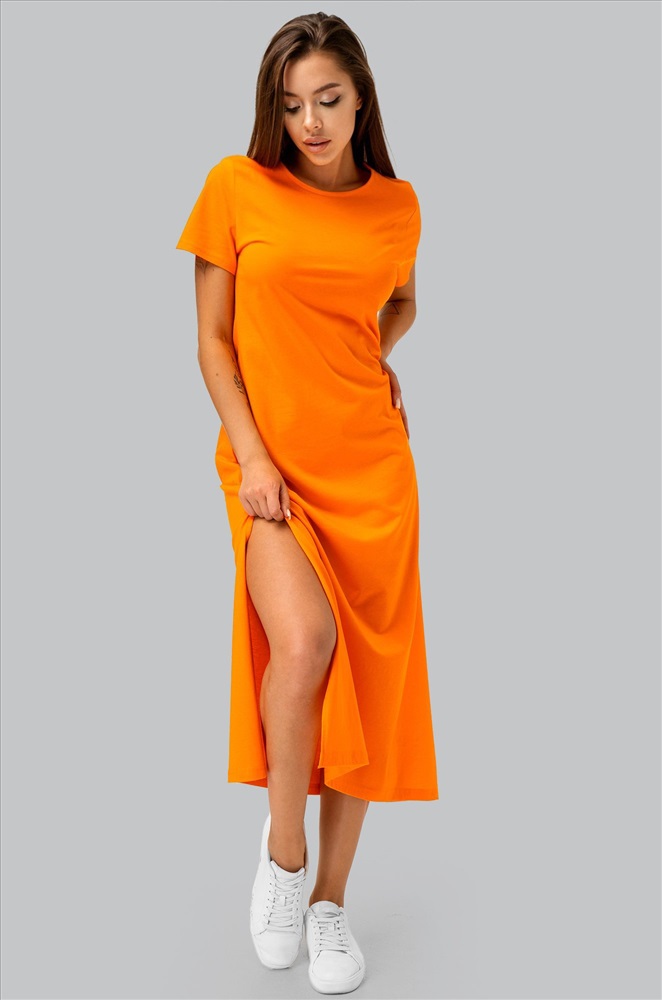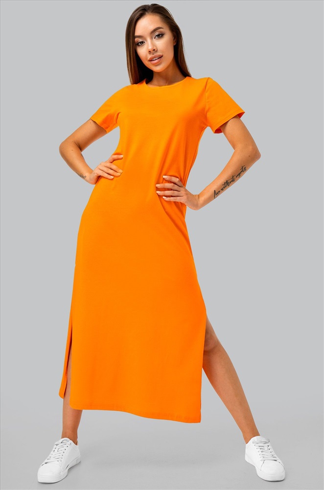 Однотонное оранжевое платье – универсальная база на каждый день. Благодаря длине миди и удобным разрезам летнее платье дарит свободу движений. Трикотажное платье подходит для прогулок летом.