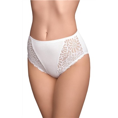 Трусы с высокой линией талии. Передняя деталь состоит из трёх частей: центральная из хлопка в виде треугольника с основанием вверху и две боковые кружевные части. Задняя деталь из хлопка. Пояс обработан швом «зигзаг». По нижнему срезу передней детали (кружевной части) эластичная тесьма с внутренней стороны, для нежного прилегания по ножке. Нижние срезы задней детали обработаны на плоскошовной машине. Состав: 75% Хлопок, 20% полиамид, 5% эластан.