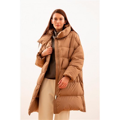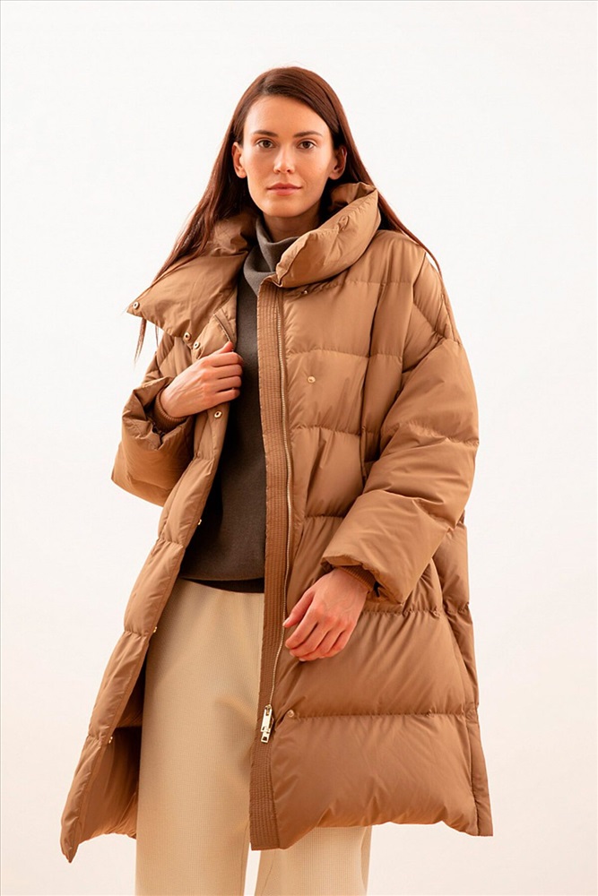 Пальто-пуховик прямого силуэта из плащевой ткани цвета "кэмел" на пуху. Крупные горизонтальные отстрочки. Рубашечный рукав, широкий воротник-стойка, карманы-листочки, центральная застёжка на молнию и пришивные кнопки. Длина чуть выше колена. Мембрана RaftPro защищает от ветра и холода. Утепленная модель. Комфорт до -20°C.* Зависит от индивидуальных теплоощущений и особенностей климата.