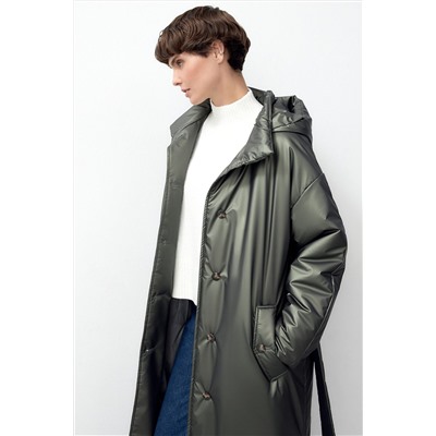 ID товара: 967102 Состав: Основная ткань- Полиэстер 100%; подкладка- Полиэстер 55%, Вискоза 45% Сезон: Демисезон Длина: Удлиненная Фасон: Прямое Рукав: длинные Вид застежки: Пуговицы Тип карманов: Прорезные Декоративные элементы: Пояс Стиль: повседневный Страна бренда: Россия Страна производства: Россия Пальто прямого силуэта из плащевой ткани цвета хаки с водонепроницаемым покрытием с эффектом сатинового блеска. Пальто имеет свободный рубашечный рукав и высокий воротник-стойку с тёплым капюшоном, который создает надёжную защиту от неблагоприятных погодных условий. По бокам пальто располагаются два глубоких кармана с клапанами на пуговицах. Застегивается пальто на ряд некрупных роговых пуговиц, которые идеально выдерживают образ и обращают внимание к деталям. Длина пальто до середины икры, для удобства шага в боковых швах выполнены разрезы с застежкой на пату и пуговицу. Образ дополняет широкий длинный пояс из основной ткани, отделанный черным репсом, на роговой пряжке. А для наилучшей защиты от непогоды пальто выполнено с использованием высокотехнологичной мембраны RaftPro и современного легкого утеплителя. Произведено в Санкт-Петербурге. Комментарии к товару