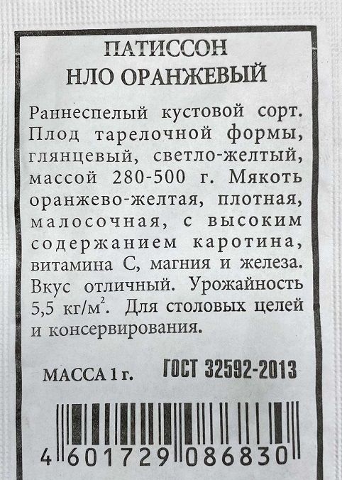 Раннеспелый (55-70 дней от полных всходов до технической спелости) сорт. Растение кустовое, главная плеть короткая. Лист среднего размера, зеленый, слаборассеченный, без пятнистости. Плод тарелочной формы, в технической спелости светло-желтый, глянцевый. Масса плода 280-500 г. Мякоть оранжево-желтая, плотная, малосочная. Вкус хороший и отличный. Посев на рассаду – в апреле, высадка в грунт в мае – июне. Посев непосредственно в грунт в конце мая – июне. Хорошо отзывается на внесение органических удобрений. Урожайность товарных плодов 2,9-5,5 кг/кв.м. Рекомендуется для столовых целей и консервирования. Схема посадки 60х60 см.
