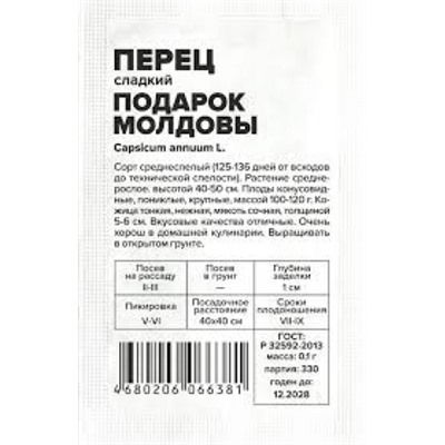 Описание растения: Растение полураскидистое, полуштамбовое, низкорослое. Плоды пониклые, конусовидные, длиной 9-10 см, в технической спелости светло-зеленые, в биологической – темно-красные, толщина стенок 4-5 мм. Сладкий перец Подарок Молдовы имеет удовлетворительные и хорошие вкусовые качества.