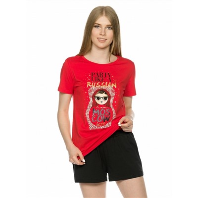 Комплект футболка и шорты. Футболка среднего объема с мягким эластичным принтом с переливающимся золотом и глиттером. Шорты с высокой посадкой, не длинные.