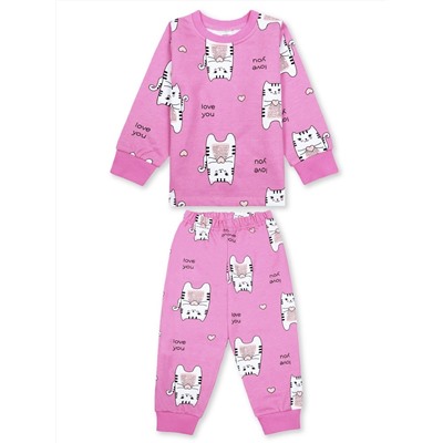 Симпатичная пижама для девочки, изготовленная из плотного материала - футера 2-нитки с начёсом. По вороту, рукавах и по низу штанов - мягкие трикотажные манжеты. Модель украшает красивый набивной рисунок по всему изделию.