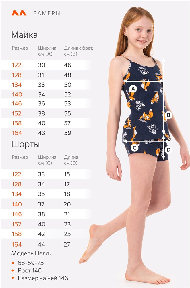 Размер 122: майка: длина:46 см; ширина:30 см.шорты: длина внеш.шва:15 см; длина внутр.шва:5 см; ширина по бедрам:33 см.Размер 128: майка: длина:48 см; ширина:31 см.шорты: длина внеш.шва:17 см; длина внутр.шва:5 см; ширина по бедрам:34 см.Размер 134: майка: длина:50 см; ширина:33 см.шорты: длина внеш.шва:18 см; длина внутр.шва:6 см; ширина по бедрам:35 см.Размер 140: майка: длина:52 см; ширина:34 см.шорты: длина внеш.шва:20 см; длина внутр.шва:7 см; ширина по бедрам:37 см.Размер 146: майка: длина:53 см; ширина:36 см.шорты: длина внеш.шва:22 см; длина внутр.шва:7 см; ширина по бедрам:38 см.Размер 152: майка: длина:55 см; ширина:38 см.шорты: длина внеш.шва:24 см; длина внутр.шва:8 см; ширина по бедрам:40 см.Размер 158: майка: длина:57 см; ширина:40 см.шорты: длина внеш.шва:26 см; длина внутр.шва:8 см; ширина по бедрам:42 см.Размер 164: майка: длина:59 см; ширина:43 см.шорты: длина внеш.шва:28 см; длина внутр.шва:9 см; ширина по бедрам:44 см.*замеры выборочные, могут незначительно отличаться.