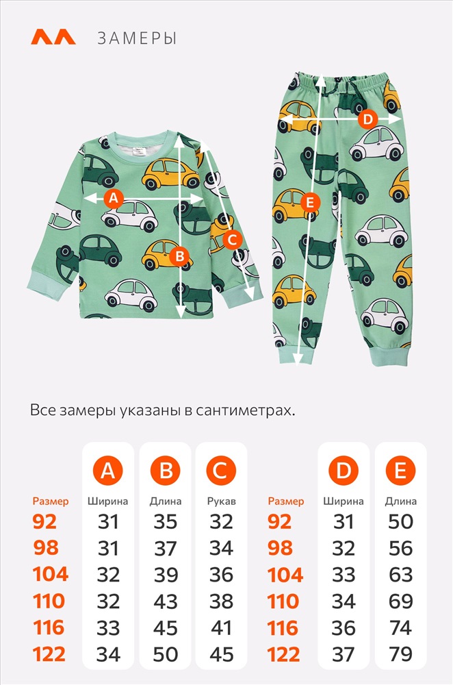 брюки: длина внеш.шва: 50 см; длина внут.шва: 30 см; ширина по бедрам: 31 см. Размер 98: джемпер: длина: 37 см; ширина: 31 см; длина рукава внешняя: 34 см; длина рукава внутренняя: 27 см. брюки: длина внеш.шва: 56 см; длина внут.шва: 35 см; ширина по бедрам: 32 см. Размер 104: джемпер: длина: 39 см; ширина: 32 см; длина рукава внешняя: 36 см; длина рукава внутренняя: 30 см. брюки: длина внеш.шва: 63 см; длина внут.шва: 40 см; ширина по бедрам: 33 см. Размер 110: джемпер: длина: 43 см; ширина: 32 см; длина рукава внешняя: 38 см; длина рукава внутренняя: 32 см. брюки: длина внеш.шва: 69 см; длина внут.шва: 45 см; ширина по бедрам: 34 см. Размер 116: джемпер: длина: 45 см; ширина: 33 см; длина рукава внешняя: 41 см; длина рукава внутренняя: 33 см. брюки: длина внеш.шва: 74 см; длина внут.шва: 50 см; ширина по бедрам: 36 см. Размер 122: джемпер: длина: 50 см; ширина: 34 см; длина рукава внешняя: 45 см; длина рукава внутренняя: 36 см. брюки: длина внеш.шва: 79 см; длина внут.шва: 53 см; ширина по бедрам: 37 см. *замеры выборочные, могут незначительно отличаться. Комментарии к товару