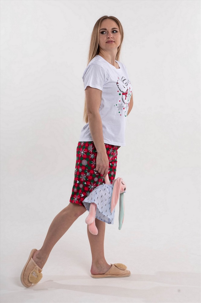Встречайте новый год и рождество с уютом и комфортом в домашней пижаме "Мелани". Пижама очень приятна к телу. Свободная футболка не стесняет движений, новогодний принт создает атмосферу праздника, горловина и рукава аккуратно подшиты, на рукавах имеется декор в виде кружевной оборки. Удобные шорты на резинке с двумя карманами имеют милый и уютный новогодний принт.
