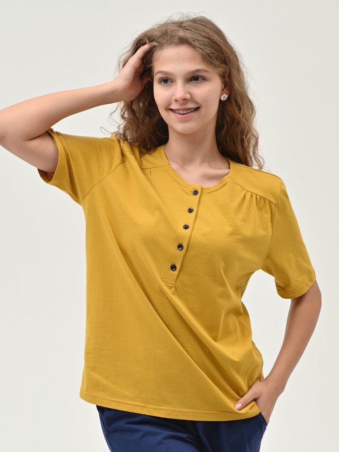 Состав: 100% хб Рост модели на фото, см: 170 Застежка: пуговицы Силуэт: свободный Вырез горловины: круглый Тип рукава: втачной Карманы: в боковом шве Артикул: 4398-11