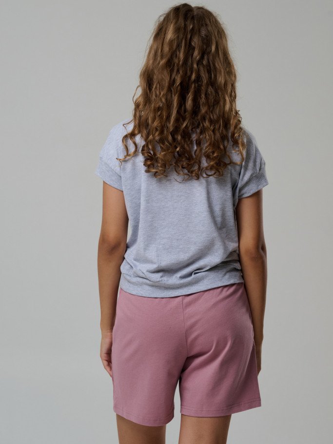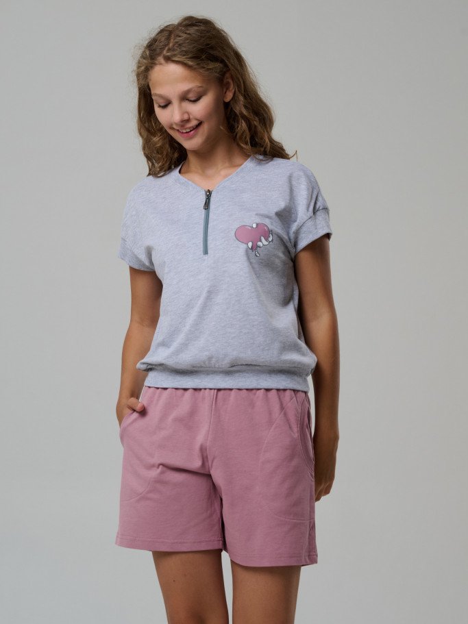 Состав: футболка 92%-хб 8%-пэ; шорты 100% хб Рост модели на фото, см: 170 Застежка: молния Силуэт: свободный Вырез горловины: круглый Карманы: в боковом шве Артикул: 4441-03