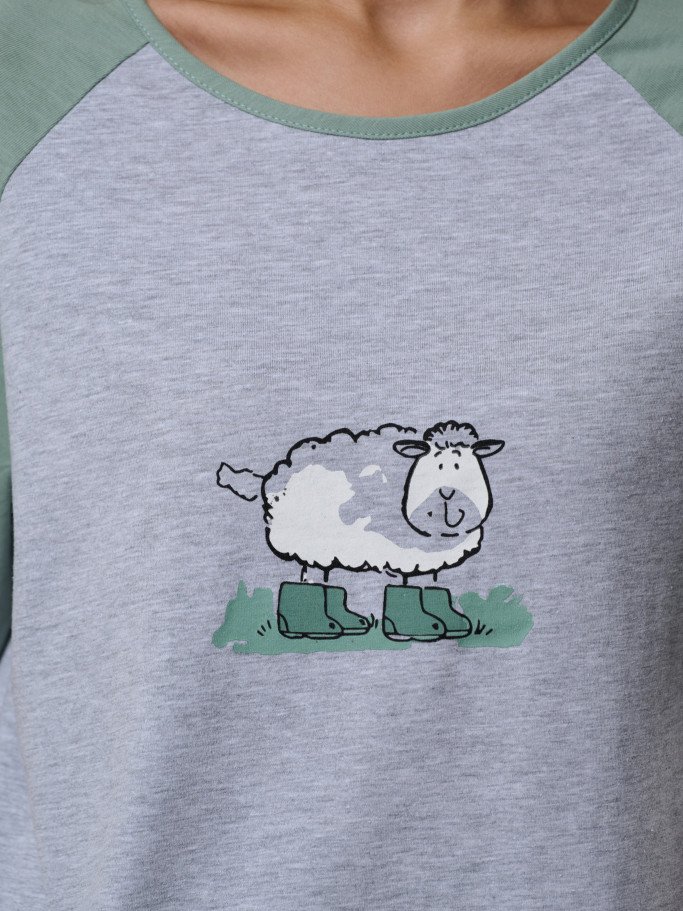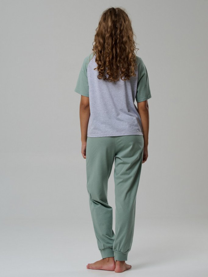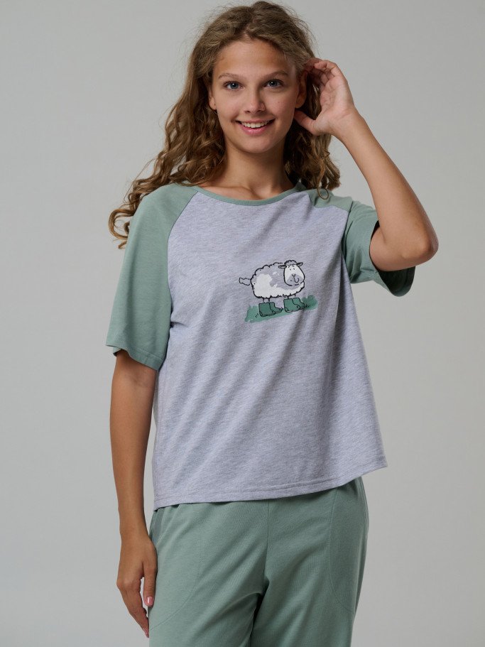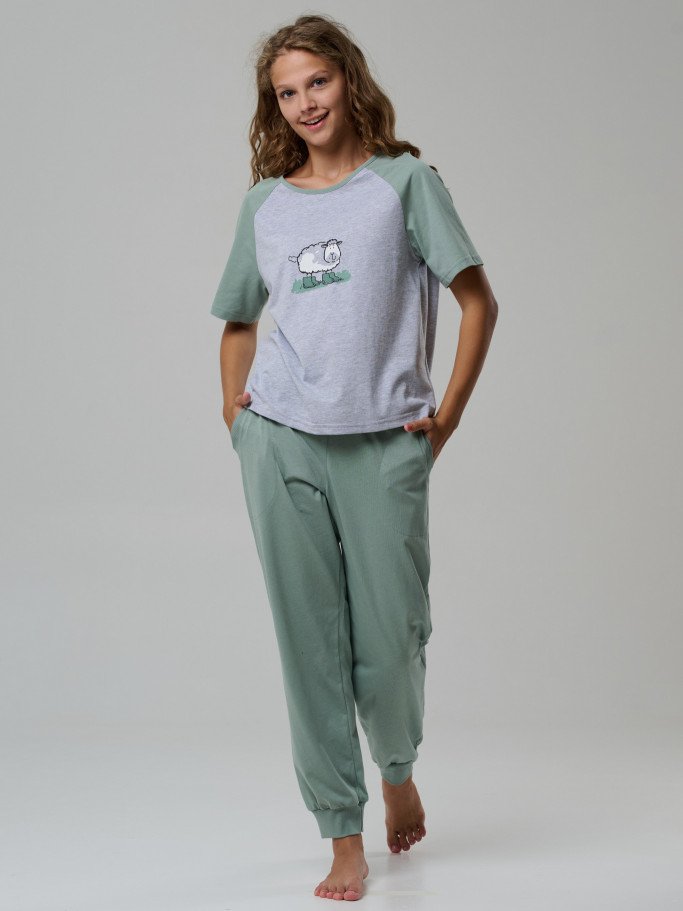 Состав: футболка 92%-хб 8%-пэ; брюки 100% хб Рост модели на фото, см: 170 Силуэт: свободный Вырез горловины: круглый Тип рукава: реглан Карманы: в боковом шве Артикул: 4458-03