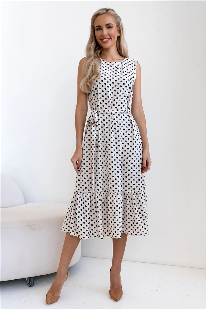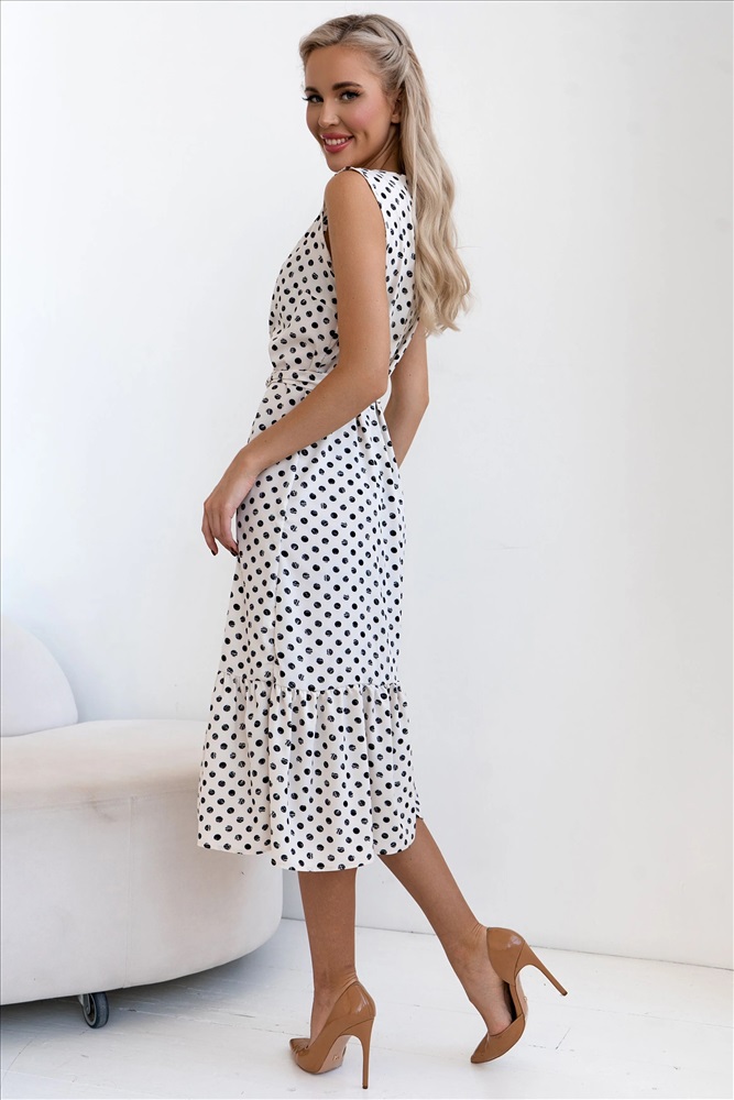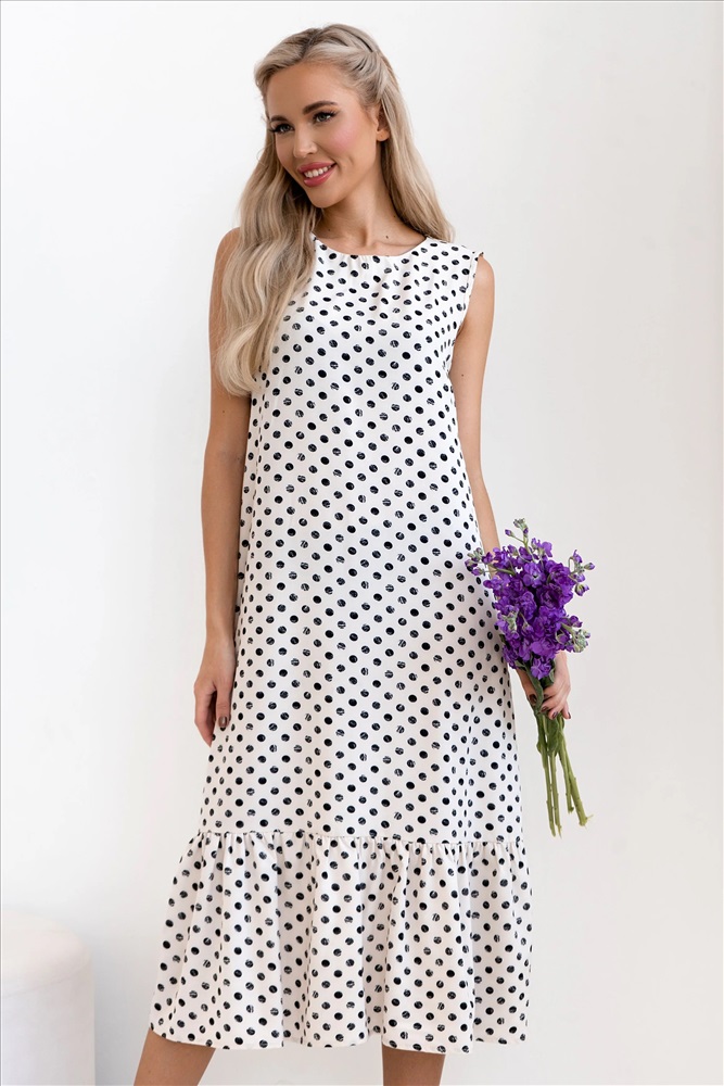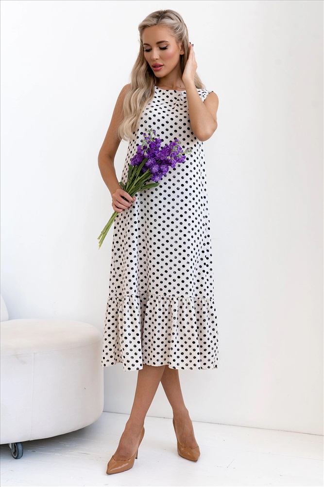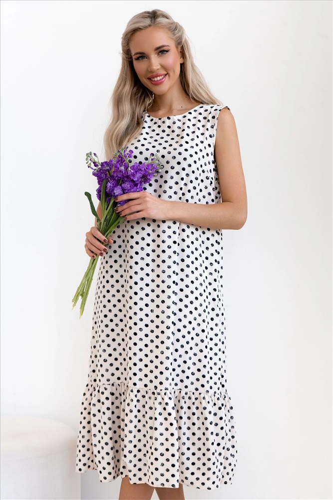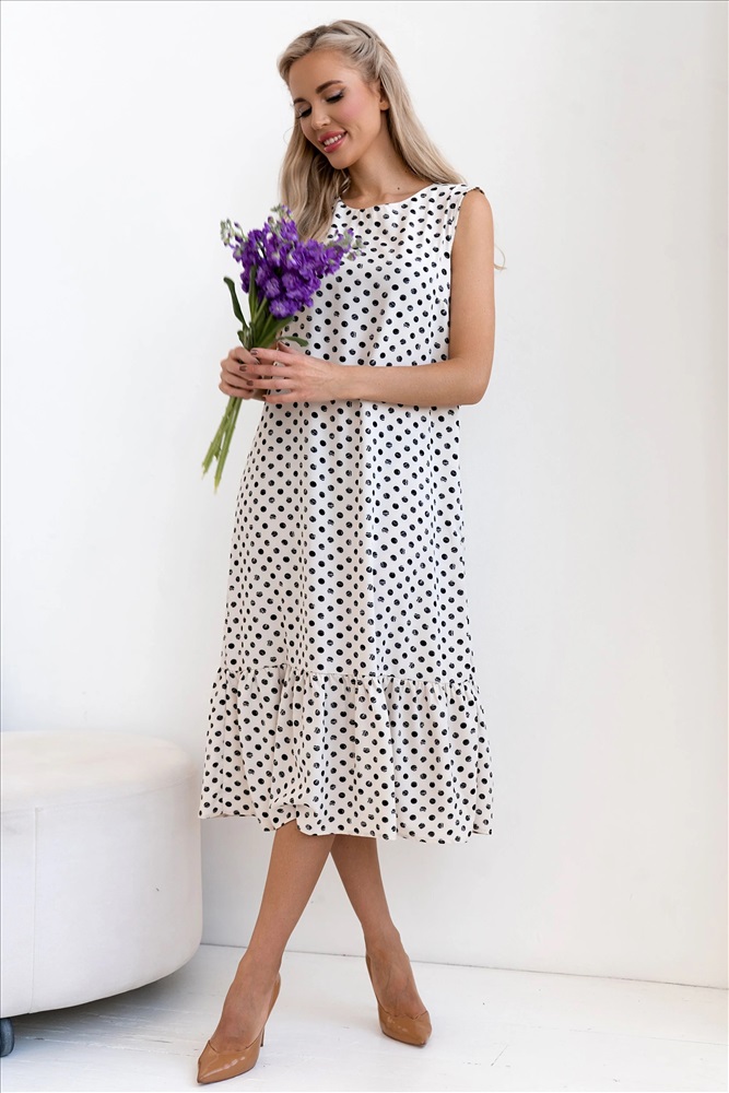 Принт в черный горошек - вечная и не устаревающая классика. Носит такое платье будет уместно абсолютно везде. Прямой крой с чуть приоткрытым плечиком, миди длинна подчеркнута широким ярусом юбки. Элегантное и женственное, игривое и озорное. Комбинируя аксессуары вы можете создать с этой моделью не меньше десятка стильных луков на праздник и каждый день.