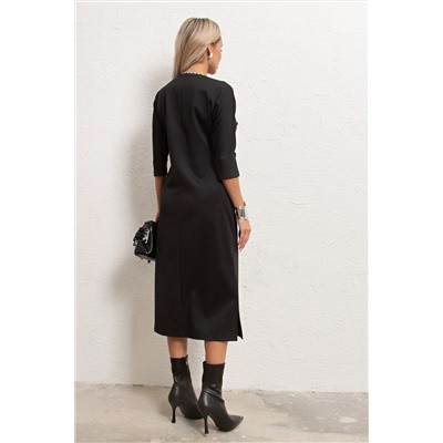 Лаконичное платье прямого силуэта выполнено из плотного трикотажного полотна. Цельнокроеный рукав длиной 3/4. V-образная горловина оформлена окантовкой, переходящую по центру переда. Низ ровный, по бокам разрезы.