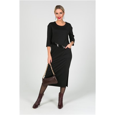 Элегантное платье прямого кроя из трикотажного полотна. Округлая горловина на внутренней обтачке. Втачные рукава длинной 3/4. Перед оформлен лампасами с пайетками и накладным карманом сбоку. Модель без молнии. Низ ровный, сбоку разрез. Идеальный вариант для любых случаев.