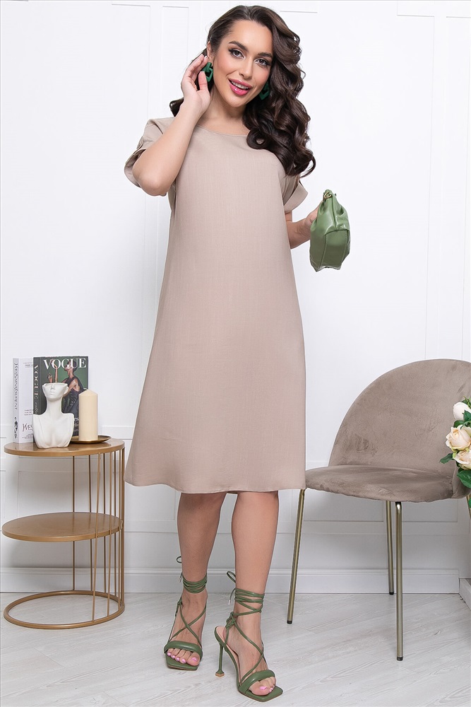 Цвет: бежевый Артикул: П5808. Ткань: вискоза. Состав: 70% вискоза, 27% п/э, 3% эластан. Цвет: бежевый. Вид застежки: без застёжки. Силуэт: свободный. Карманы: отсутствуют. Тип горловины: округлый. Длина изделия по спинке: 46-48/ 104 см, 50-52/ 105 см, 54-56/ 106 см. Рост модели: 167 см. Элегантное платье, которое подходит как для создания свободного образа, так и для более утонченного. В комплект входит ремень из основной ткани, который подчеркивает все преимущества фигуры и придает женственности. Рукав укороченный, цельнокроенный с отворотом.  Уход за изделием: бережная стирка до 30 градусов; нельзя отбеливать; деликатный отжим; гладить при t не более 110 С; гладить с изнанки. *Допуск отклонения длины при массовом производстве 1-3 см является нормой.