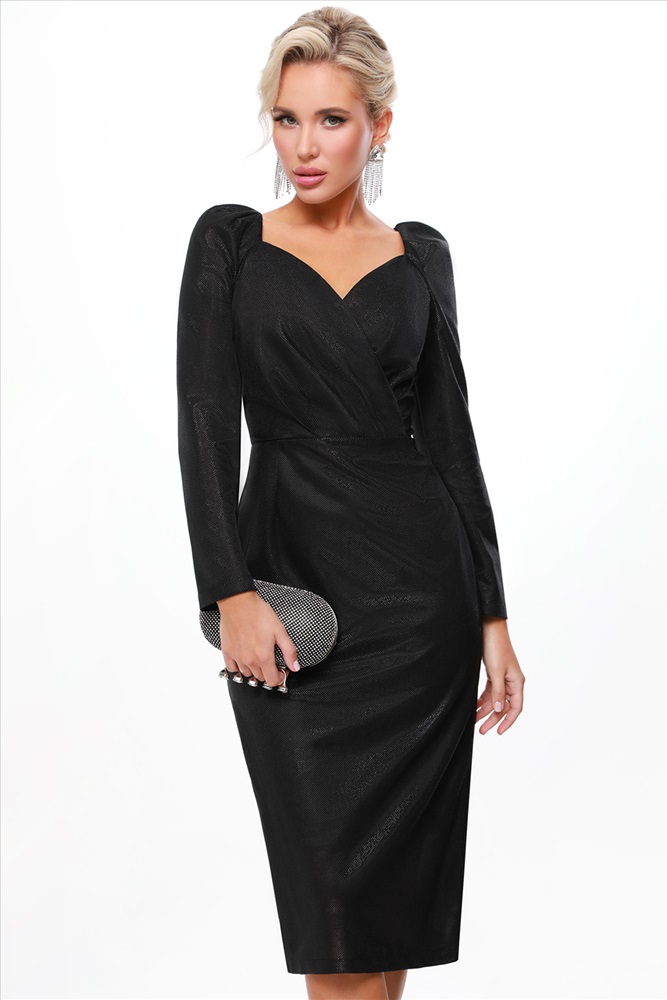Декоративные элементы: Складки Вид застёжки: Молния Вырез горловины: Фигурный вырез Длина изделия по спинке: 113 Модель платья: Полуприлегающий силуэт Назначение: Вечерняя мода Тип рукава: Длинный Уход за вещами: Бережная стирка при 30 градусах Фактура материала: Трикотажный Состав: 95% полиэстер, 5% эластан Тип ткани: Трикотаж с блеском Цвет: Чёрный Блестящее платье миди — восхитительный вечерний вариант, который будет приковывать взгляды на любом праздничном мероприятии. Прилегающий верх на запах с драпировкой эффектно подчеркивает зону декольте, зрительно удлиняет шею и придает грациозности. Длинные рукава с небольшими сборками на плечиках добавляют наряду легкости. Низ фасона «карандаш» с завышенной талией красиво очерчивает привлекательные изгибы тела. Нарядное платье выполнено из трикотажного материала, который роскошно переливается на свету, слегка тянется и позволяет чувствовать себя комфортно. Чтобы изделие не утратило первоначальный вид, рекомендована деликатная стирка при температуре не более 30 градусов без отжима. Длина: 44 размер - 113 см 46 размер - 113 см 48 размер - 114 см 50 размер - 114 см 52 размер - 115 см 54 размер - 115 см 56 размер - 116 см Бережная стирка при 30 градусах Цвет изделия на фотографии может отличаться от фактического товара, что связано с искажением цветопередачи монитором, настройками фотоаппаратуры и прочими факторами Пропорции