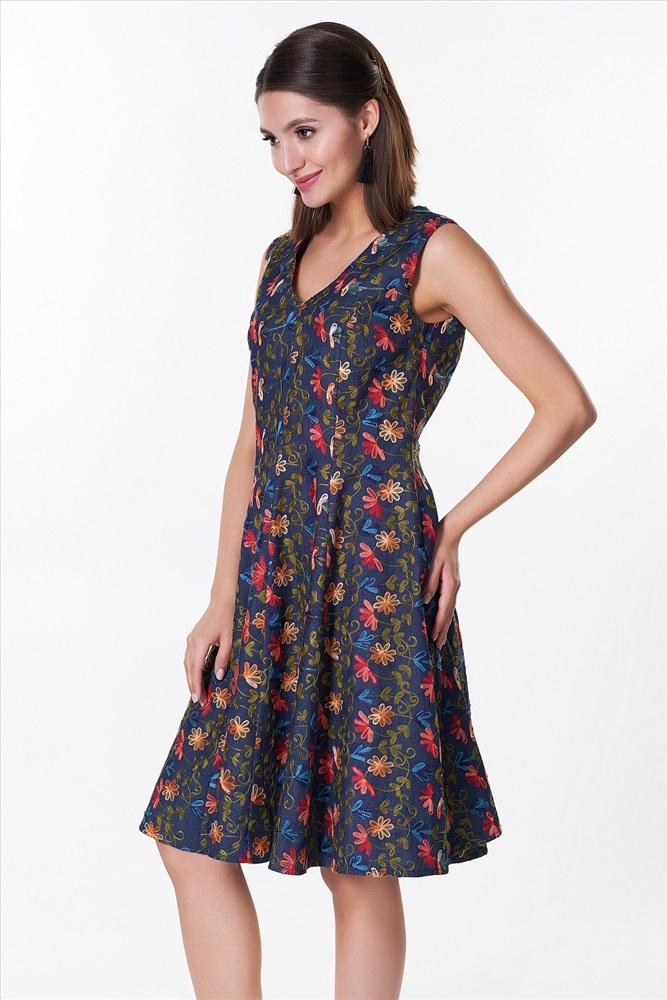 Ткань: 100% хлопок ОПИСАНИЕСтильное платье прилегающего силуэта из натурального полотна с цветочной вышивкой. V-образная горловина и проймы на внутренней обтачке. Модель дополнена вытачками, обеспечивающими идеальную посадку на талии. В среднем шве спинки расположена потайная застежка на молнию. Низ ровный, без разрезов. Длина изделия: 95 см Рост фотомодели: 170 см Размер фотомодели: 42 Ткань: деним с вышивкой Комментарии к товару