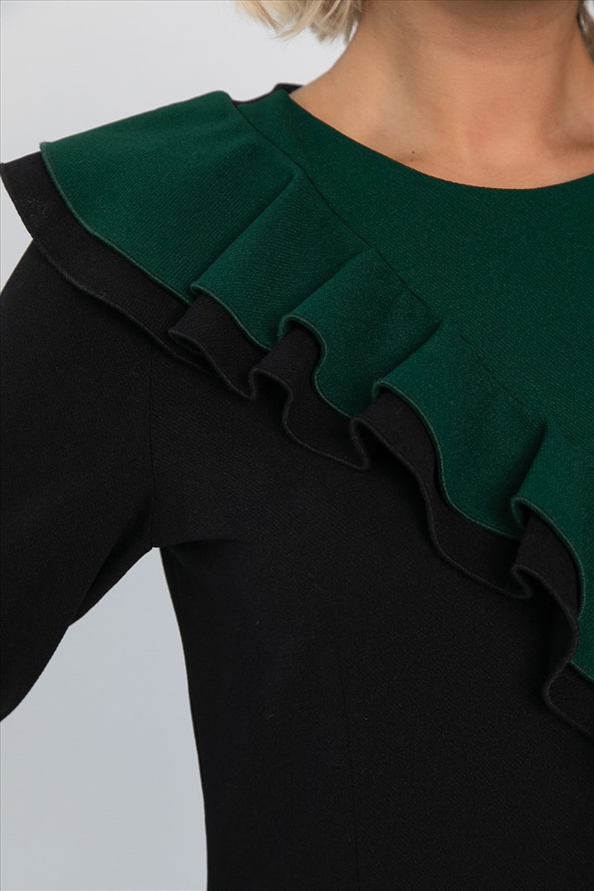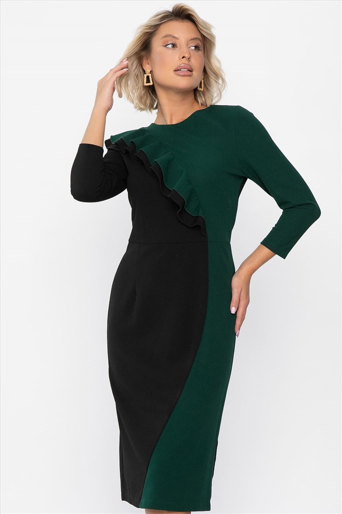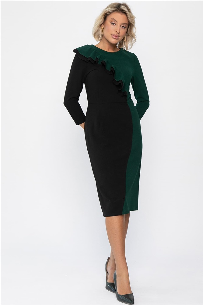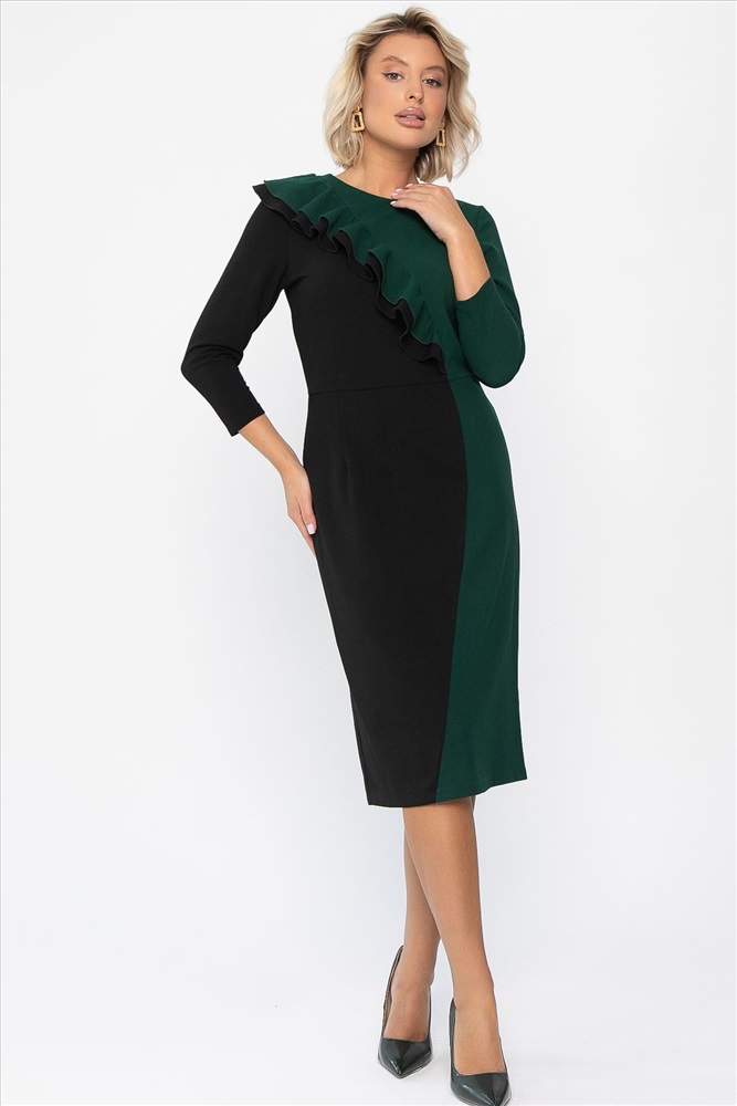 Роскошное платье, спереди комбинированное из двух цветов создающая свою уникальность, за счет двойного волана на лифе. Модель имеет рукава 3/4 и может стать достойным повседневным нарядом на осень и зиму для девушек, любящих выглядеть элегантно в любой ситуации – на вечеринке и на работе.