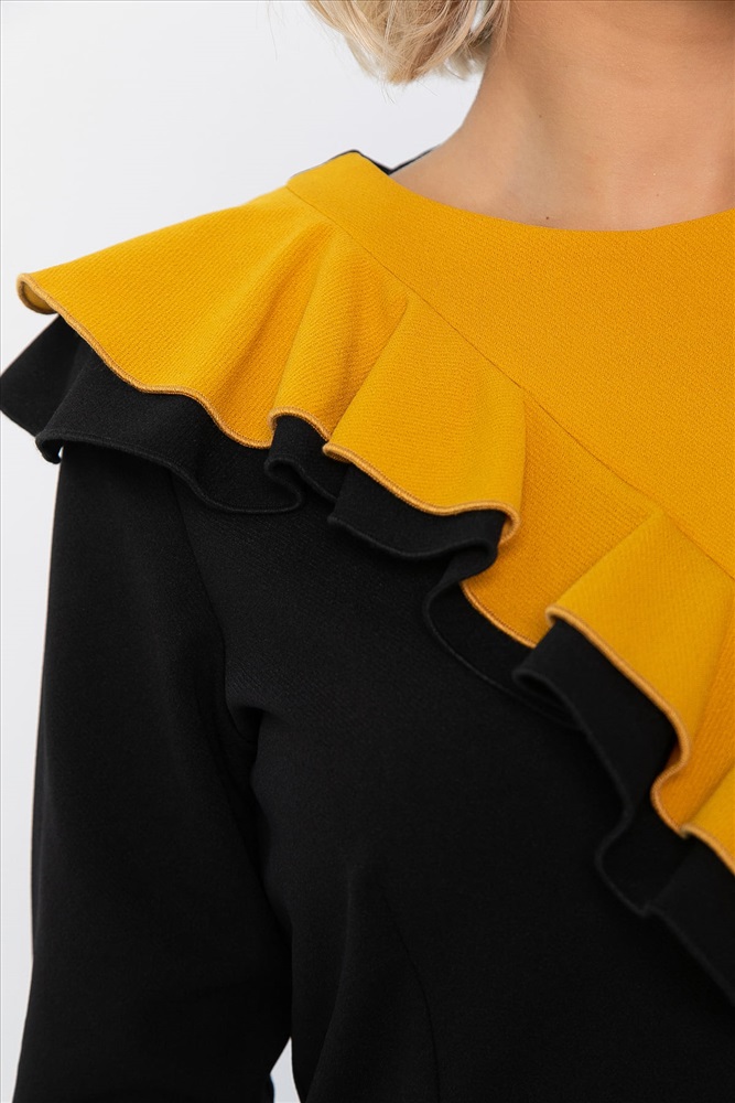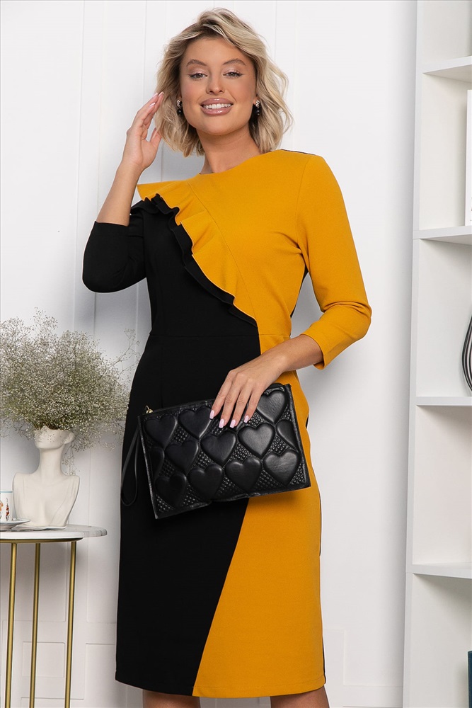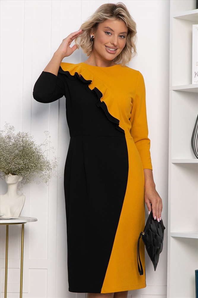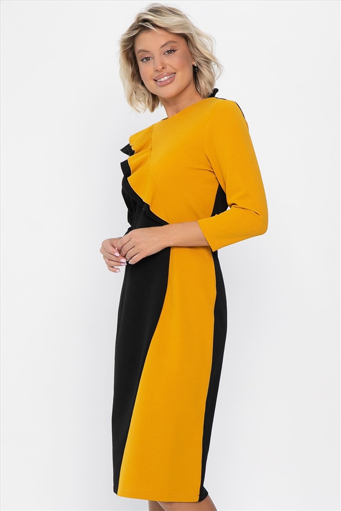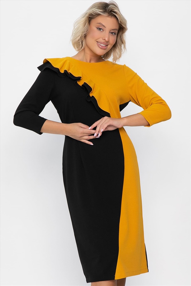 Роскошное платье, спереди комбинированное из двух цветов создающая свою уникальность, за счет двойного волана на лифе. Модель имеет рукава 3/4 и может стать достойным повседневным нарядом на осень и зиму для девушек, любящих выглядеть элегантно в любой ситуации – на вечеринке и на работе.