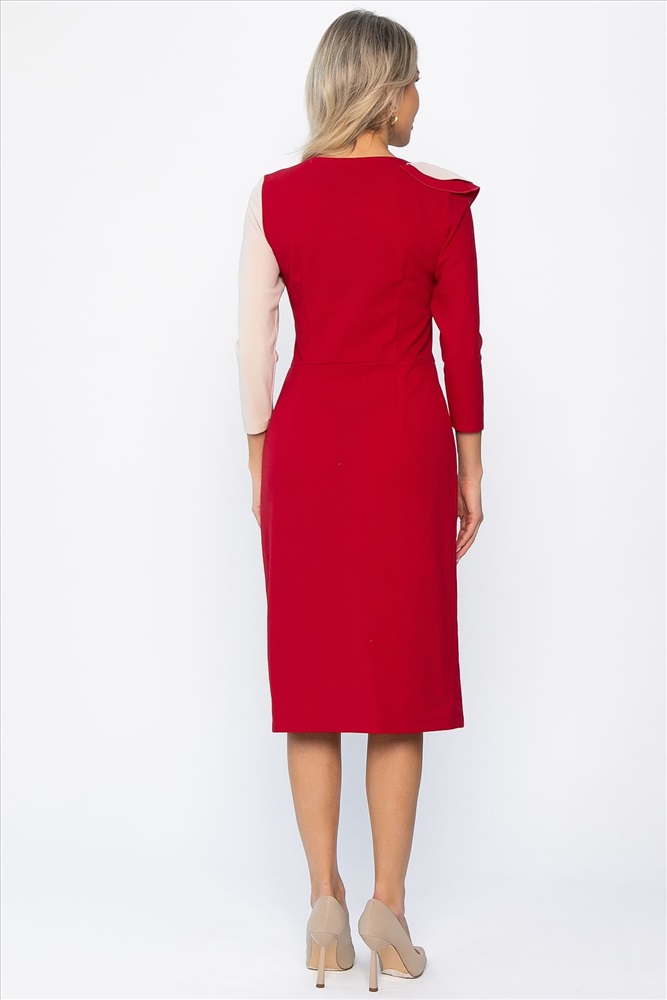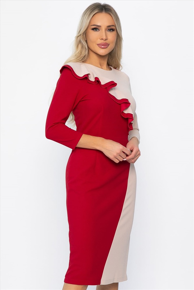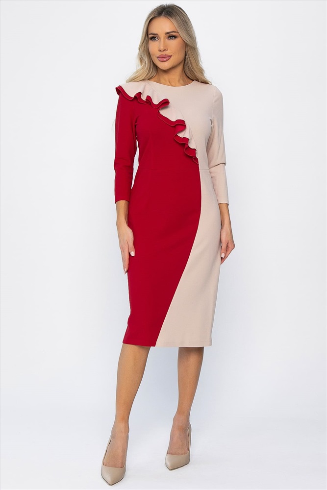 Роскошное платье, спереди комбинированное из двух цветов создающая свою уникальность, за счет двойного волана на лифе. Модель имеет рукава 3/4 и может стать достойным повседневным нарядом на осень и зиму для девушек, любящих выглядеть элегантно в любой ситуации – на вечеринке и на работе.