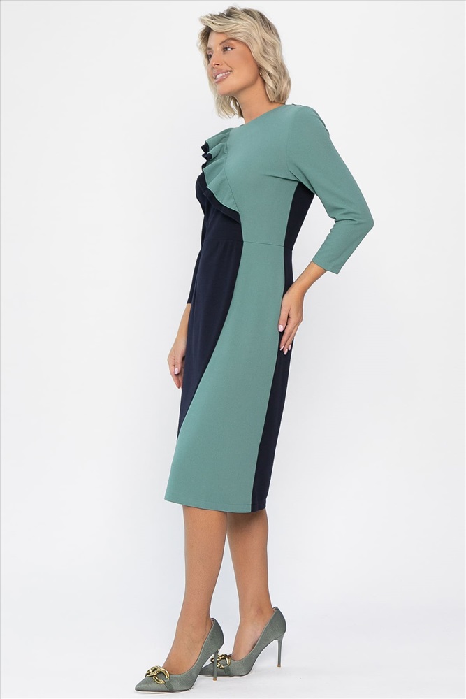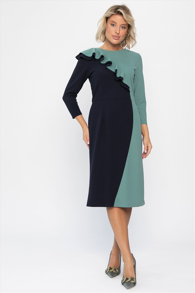 Роскошное платье, спереди комбинированное из двух цветов создающая свою уникальность, за счет двойного волана на лифе. Модель имеет рукава 3/4 и может стать достойным повседневным нарядом на осень и зиму для девушек, любящих выглядеть элегантно в любой ситуации – на вечеринке и на работе.