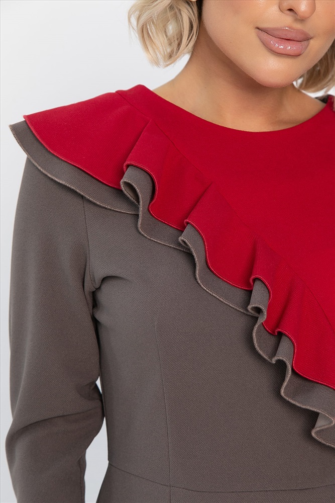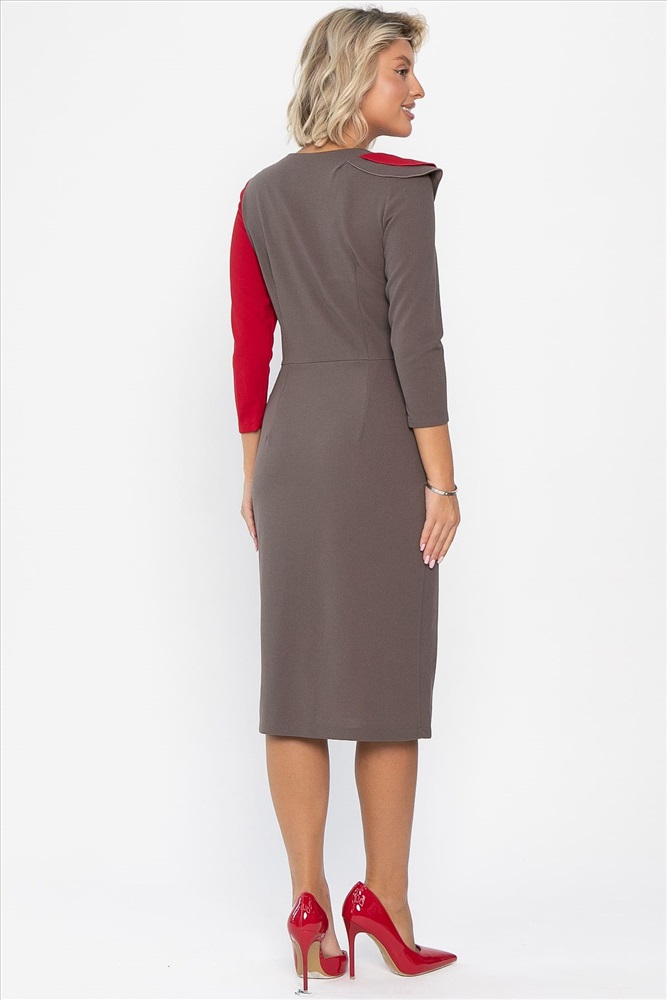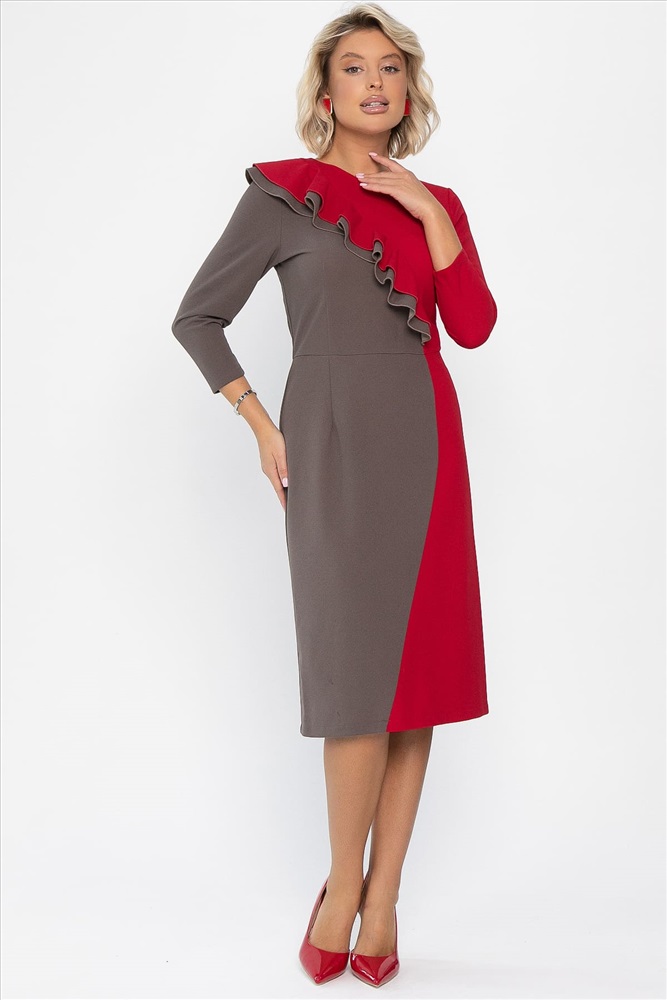 Роскошное платье, спереди комбинированное из двух цветов создающая свою уникальность, за счет двойного волана на лифе. Модель имеет рукава 3/4 и может стать достойным повседневным нарядом на осень и зиму для девушек, любящих выглядеть элегантно в любой ситуации – на вечеринке и на работе.