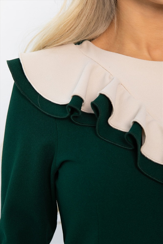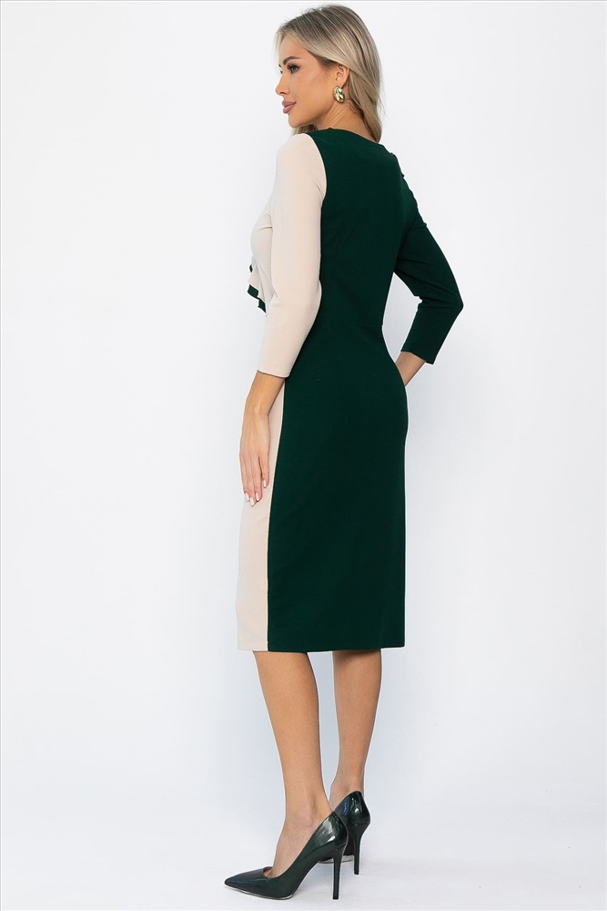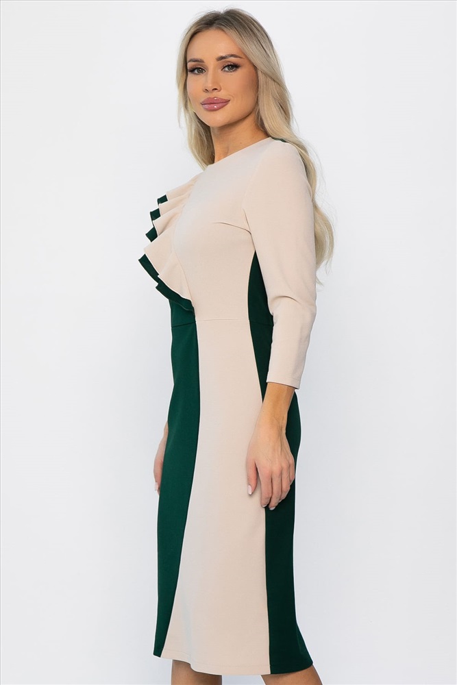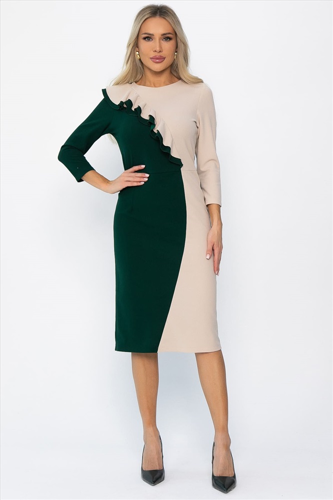 Роскошное платье, спереди комбинированное из двух цветов создающая свою уникальность, за счет двойного волана на лифе. Модель имеет рукава 3/4 и может стать достойным повседневным нарядом на осень и зиму для девушек, любящих выглядеть элегантно в любой ситуации – на вечеринке и на работе.