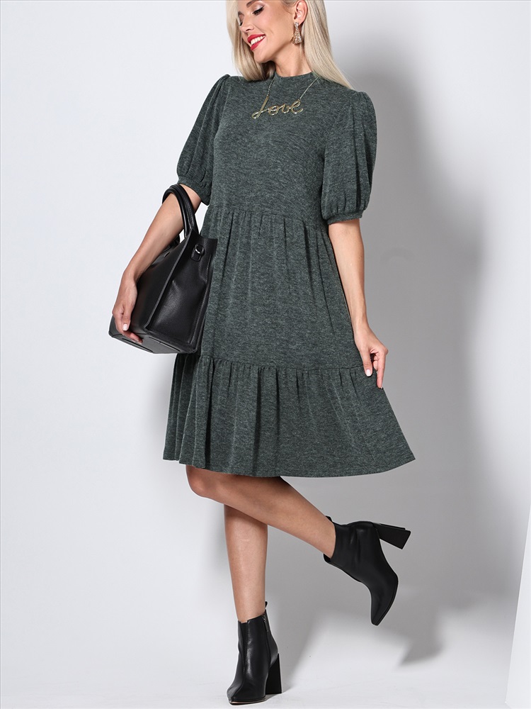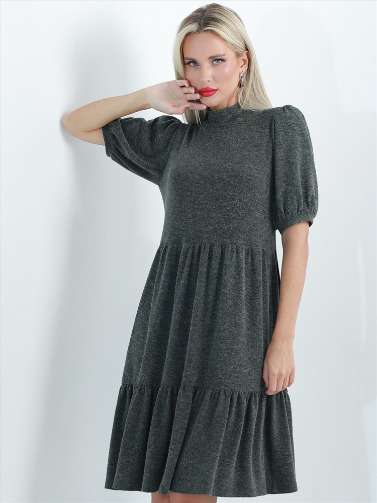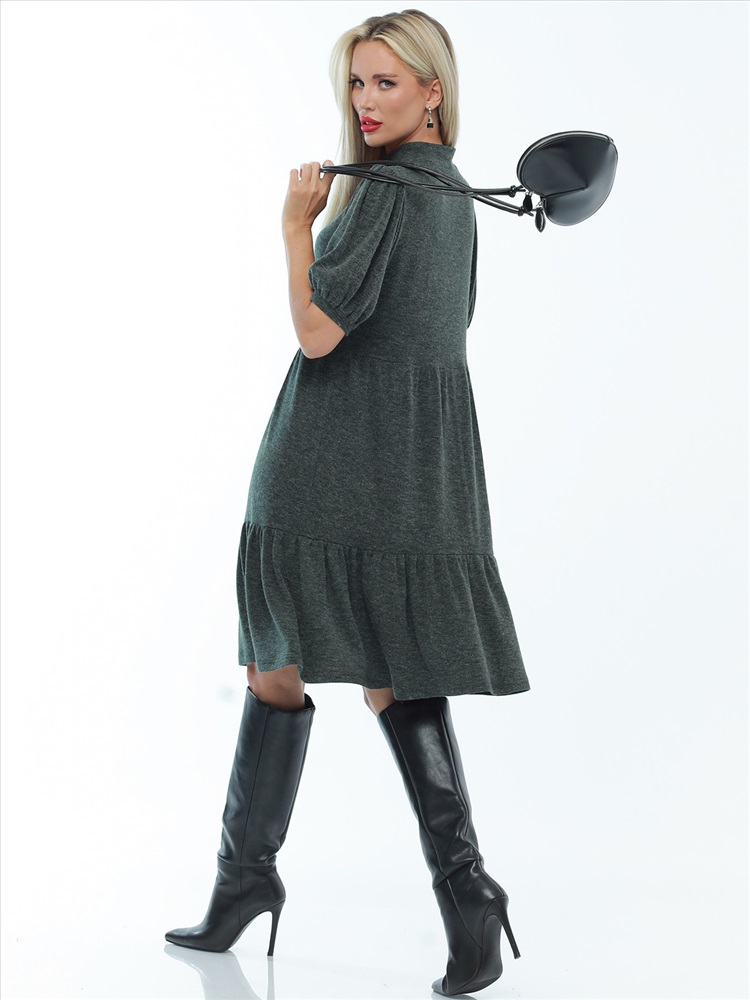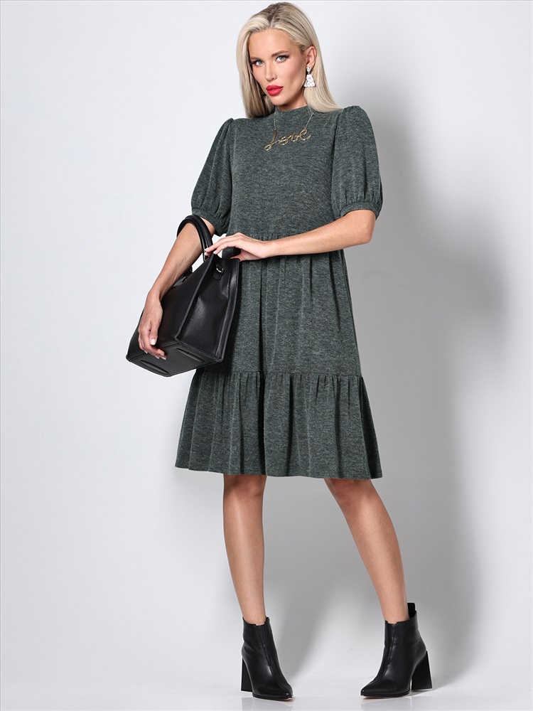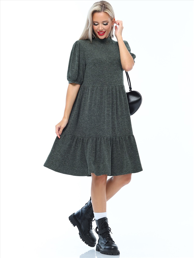 Декоративные элементы: Оборка Вид застёжки: Без застежки Вырез горловины: Воротник-стойка Длина изделия по спинке: 99 Модель платья: А-силуэт Назначение: Повседневная Тип рукава: Короткий Уход за вещами: Бережная стирка при 30 градусах Фактура материала: Трикотажный Состав: 65% полиэстер, 30% вискоза, 5% эластан Тип ткани: Трикотаж Цвет: Серо-зелёный Платье изготовлено из трикотажной ткани, что отличает его своей легкостью и мягкостью, обеспечивая высокий уровень комфорта при носке. Свободный силуэт с ярусными оборками плавно расклешается к низу, дарит чувство легкости и прекрасно смотрится на женщинах любой комплекции. Пышные рукава выглядят кокетливо и нежно. Вы будете чувствовать себя настоящей модницей в этом платье, которое подчеркнет вашу красоту и изящество. Длина: 44 размер - 99 см 46 размер - 99 см 48 размер - 100 см 50 размер - 100 см 52 размер - 101 см 54 размер - 101 см Бережная стирка при 30 градусах Цвет изделия на фотографии может отличаться от фактического товара, что связано с искажением цветопередачи монитором, настройками фотоаппаратуры и прочими факторами Пропорции