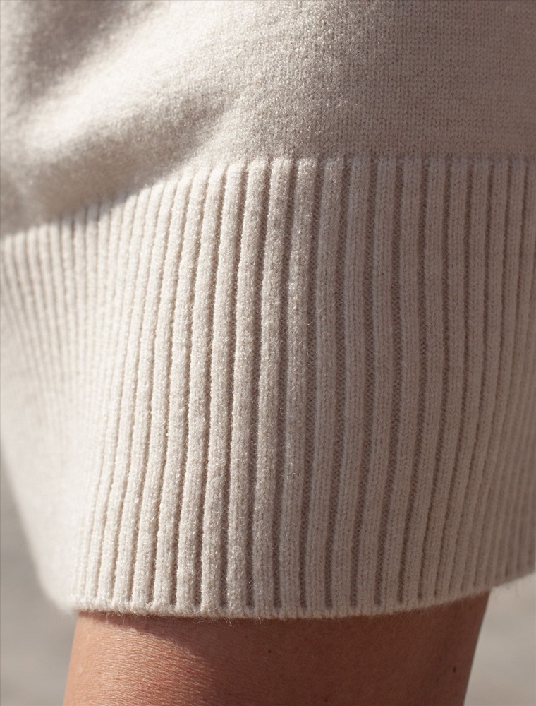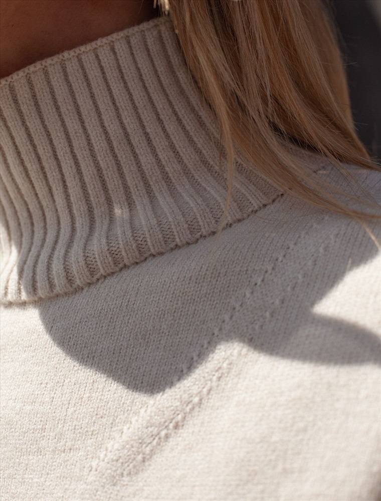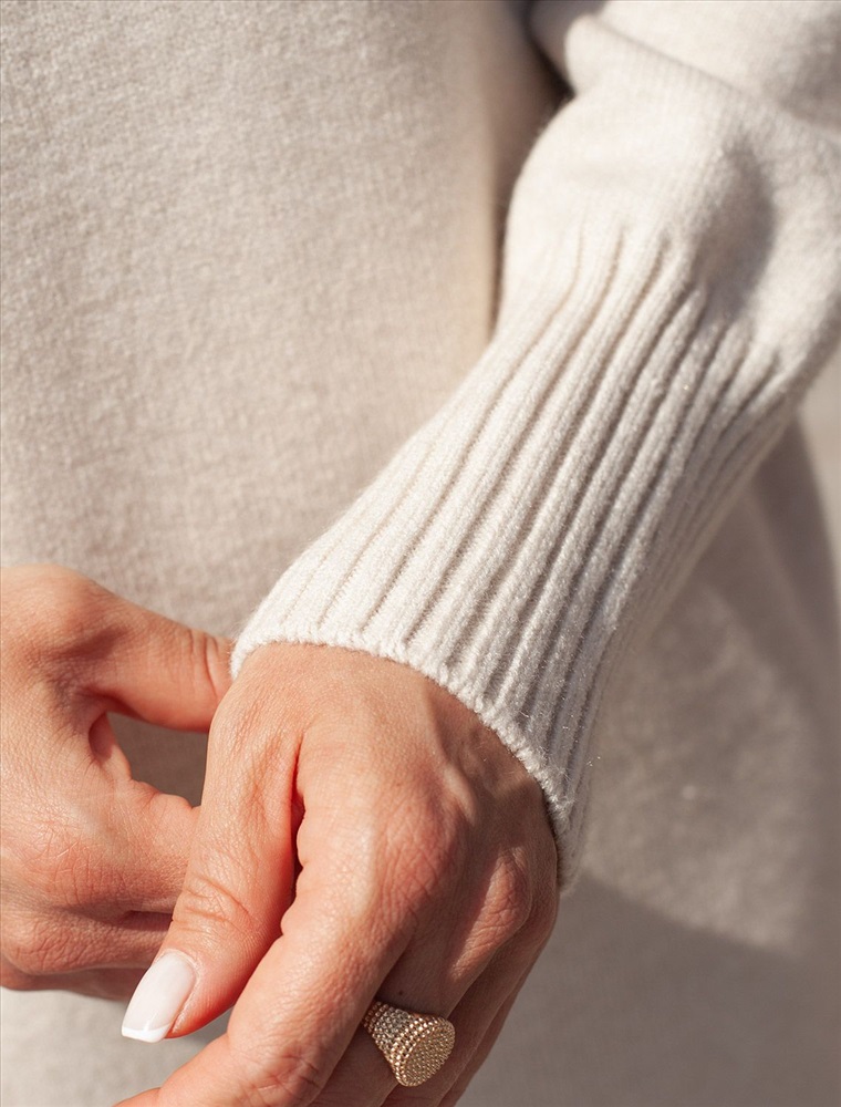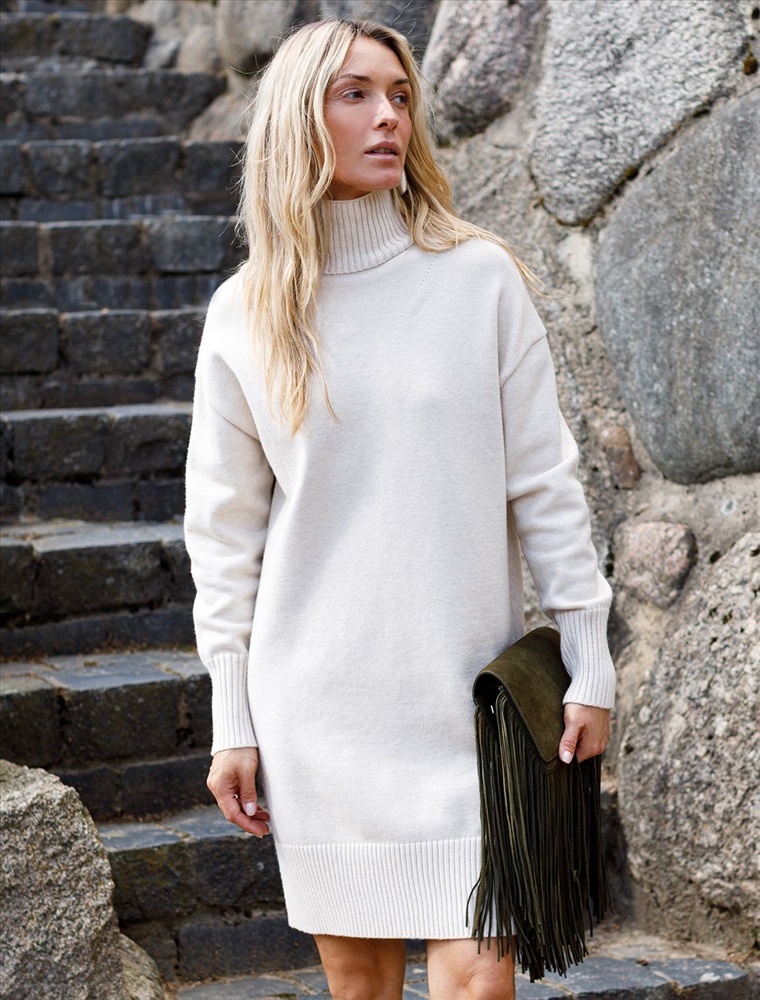 Платье с воротом стойка выполнено из мягкой меланжевой пряжи с кашемиром. Модель свободного силуэта со спущенным плечом хорошо впишется в расслабленные осенне-зимние аутфиты с высокими сапогами. Изделие очень приятное к телу, совершенно не колется и отлично сохраняет тепло при этом не перегревая.
