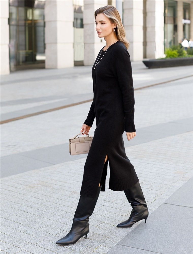 Плотность: 7 GG Размер товара на первом фото: 42 Платье длины миди выполнено из мягкой меланжевой пряжи с кашемиром. Модель прямого силуэта дополнена двумя высокими боковыми разрезами. Вязаный кант вертикально проходящий по всему изделию, визуально стройнит и вытягивает силуэт. При желании можно подчеркнуть линию талии, используя контрастный пояс. Комментарии к товару