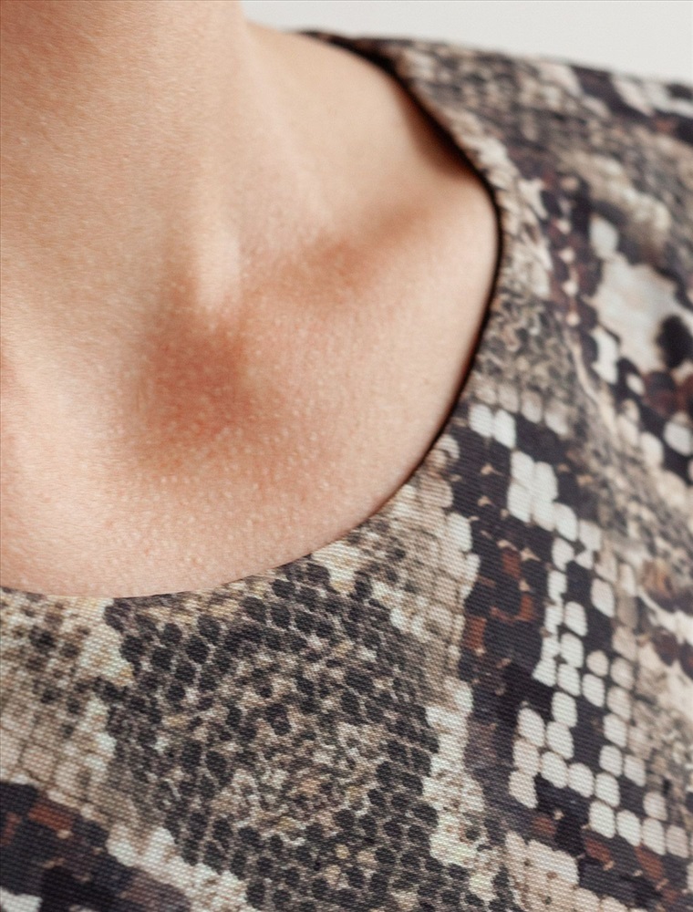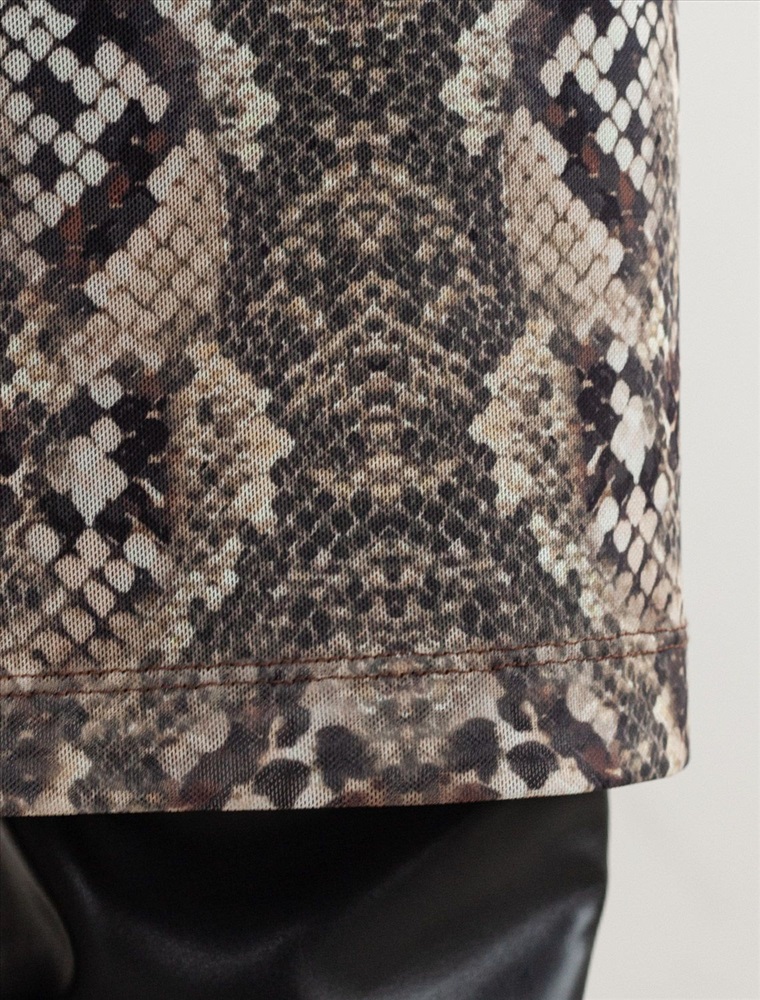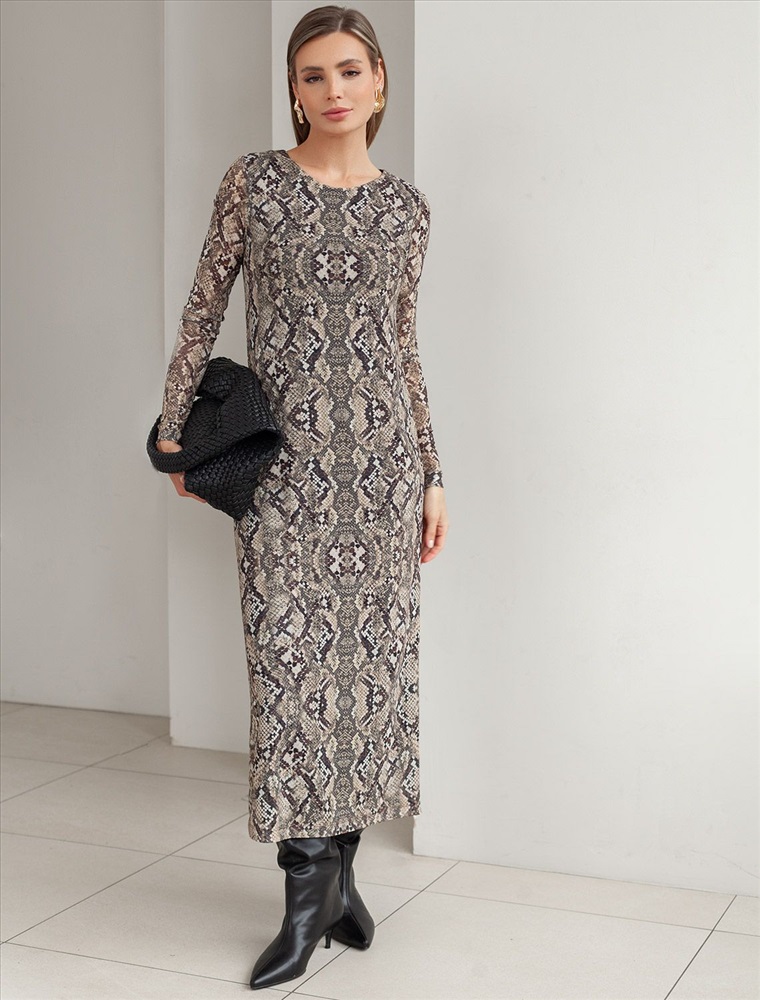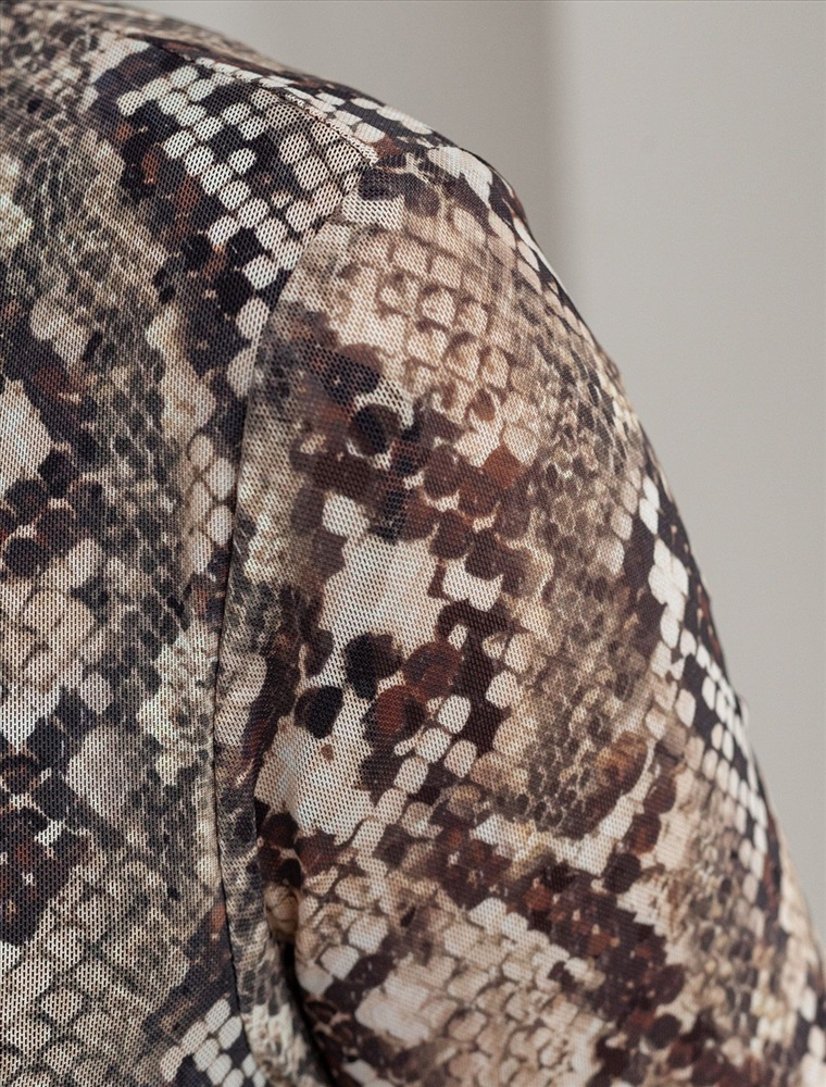 Плотность: 90 Г/м2 Трендовая модель с эффектным змеиным принтом в коричнево-бежевой гамме. Прямой крой из мягкой сетки на вискозной подкладке создает изящный силуэт. Игра полупрозрачной ткани и подклада добавляет глубину образу. Идеально для вечерних образов с золотистыми аксессуарами. Комментарии к товару