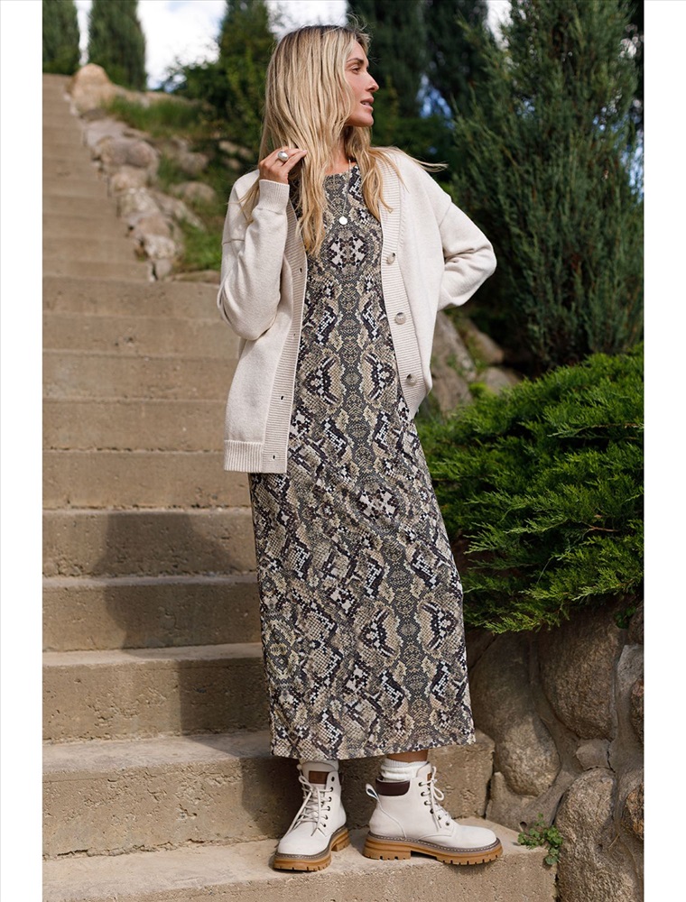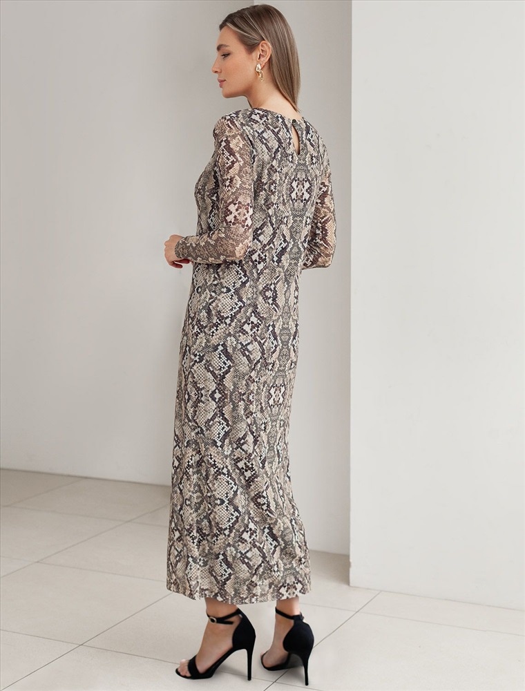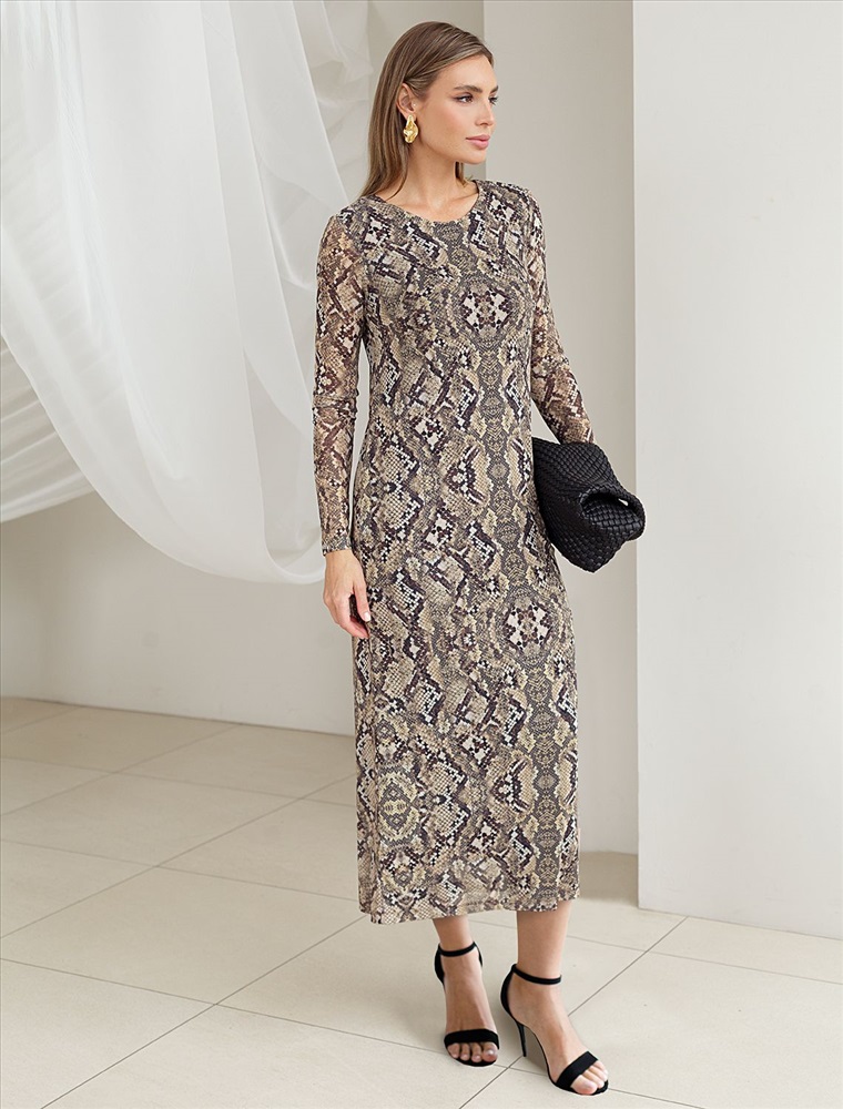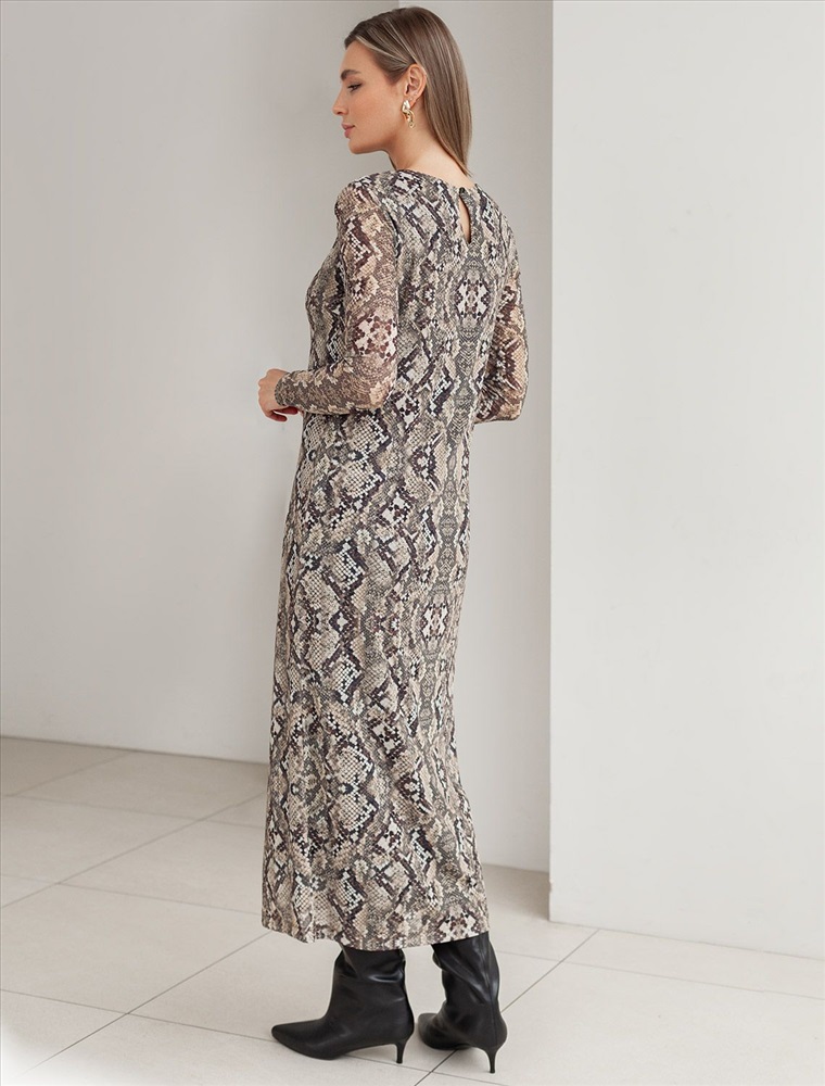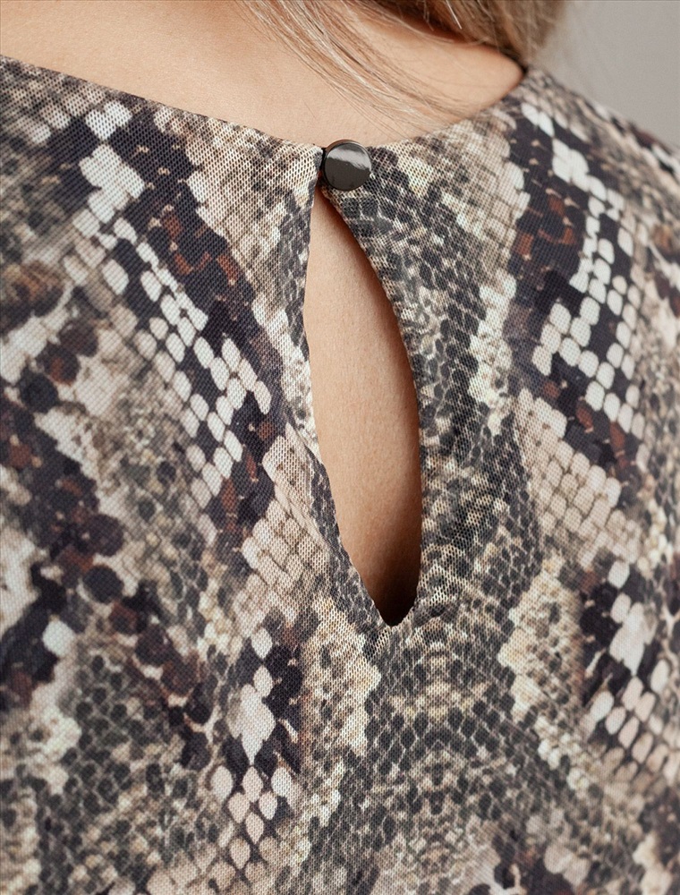 Плотность: 90 Г/м2 Трендовая модель с эффектным змеиным принтом в коричнево-бежевой гамме. Прямой крой из мягкой сетки на вискозной подкладке создает изящный силуэт. Игра полупрозрачной ткани и подклада добавляет глубину образу. Идеально для вечерних образов с золотистыми аксессуарами. Комментарии к товару