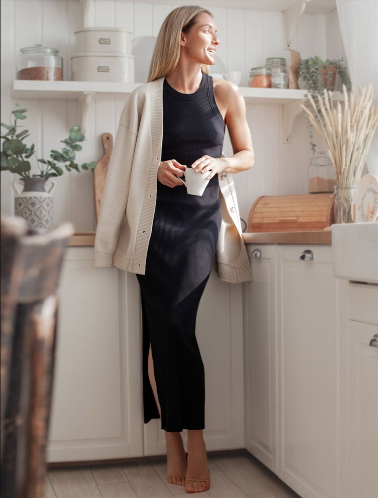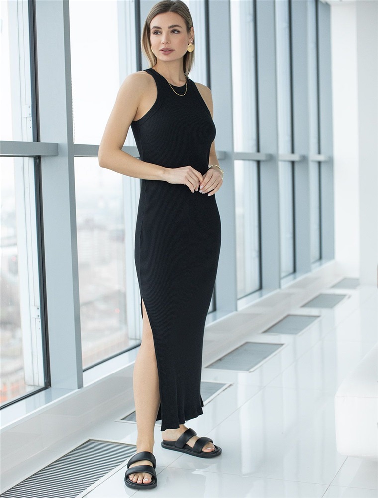 Плотность: 200 Г/м2 Платье выполнено из трикотажа в широкий рубчик. Модель дополнена высоким разрезом сбоку. Эластичный хлопковый трикотаж идеально сидит по фигуре, не сковывает движений и очень комфортный в носке. Фактура вертикальных полос визуально стройнит и вытягивает силуэт. Изделие хорошо впишется как в повседневный гардероб, так и для вечерних аутфитов.