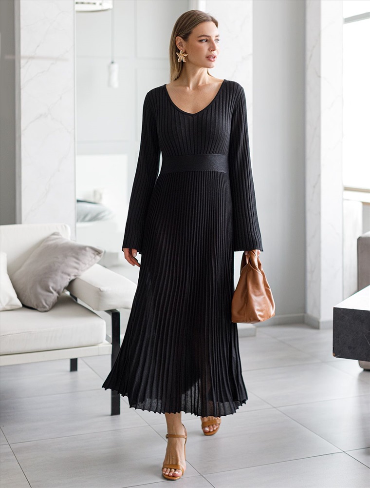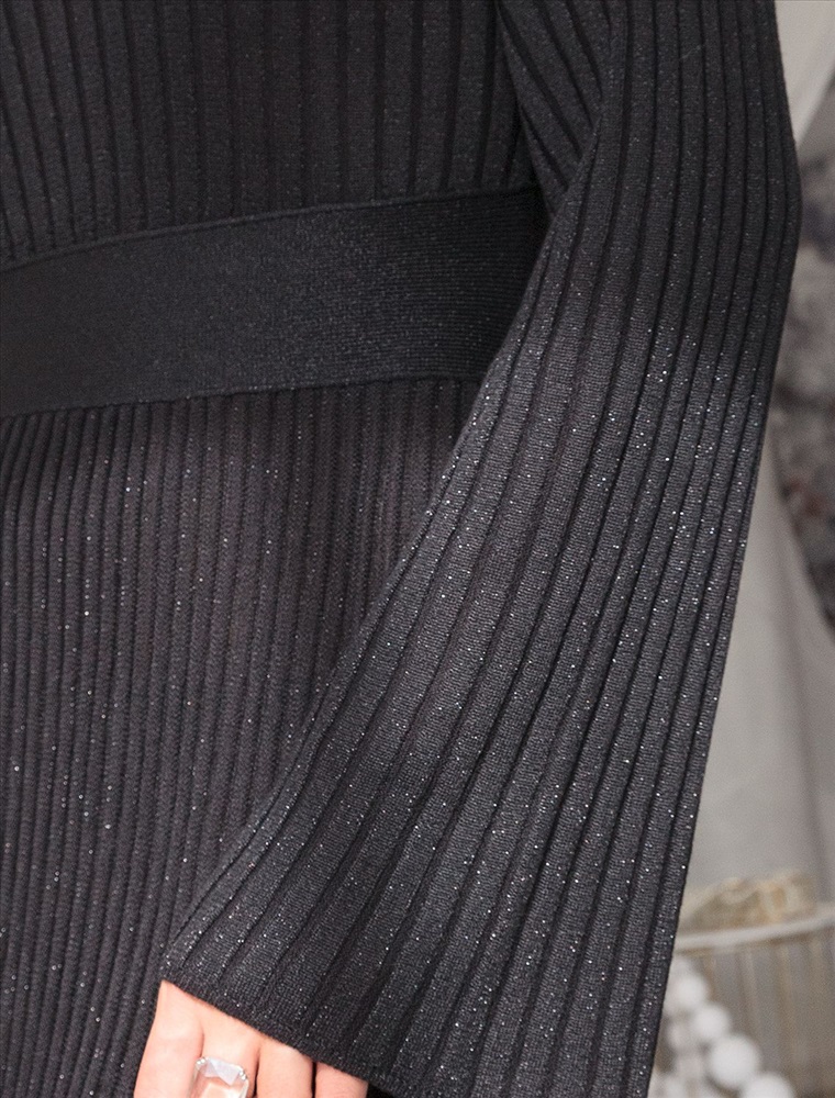Платье А-силуэта выполнено из вискозы тонкой вязки с мягким люрексом. Модель с V- вырезом сидит по фигуре, подчеркивая женственные изгибы тела. Поперечная резинка на талии визуально делает талию уже, создавая эффект песочных часов. Юбка со складками в стиле "гофре" струится по бедрам. Изящный блеск пряжи позволяет носить изделие, как на торжественный выход, так и в повседневной жизни.