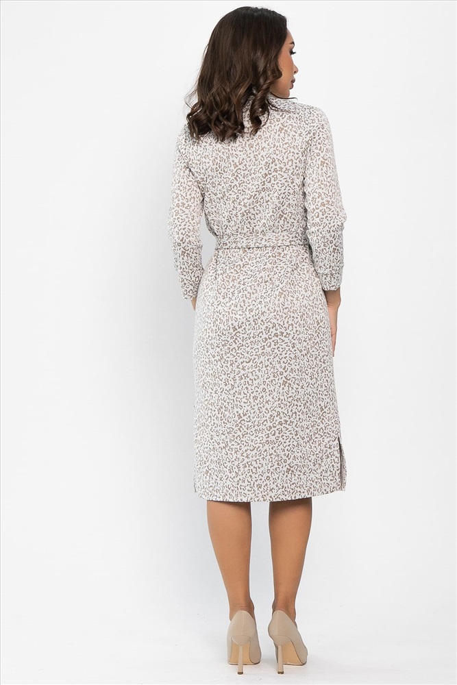 Трикотажное платье в молочном оттенке с леопардовым принтом станет прекрасным дополнением в вашем гардеробе. Пояс из основной ткани, входящий в комплект, поможет подчеркнуть талию. Рукава длиной 3/4 оканчиваются манжетом. Создано для тех, кто ценит удобство, элегантность и индивидуальность стиля одновременно. Идеальное решение для повседневности, офиса или вечернего выхода.