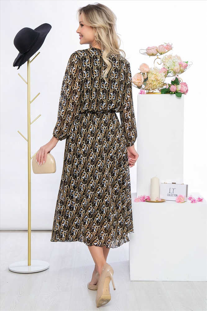 Платье из шифона с оригинальным принтом придаст вам привлекательный вид и создаст прекрасное настроение. Нежная и струящаяся фактура ткани выгодно подчеркнет достоинства фигуры, а пояс из основной ткани сделает акцент на талии.