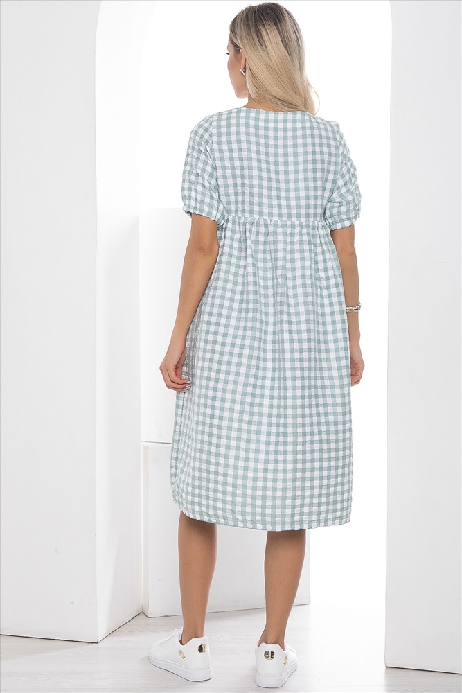 Платье с отрезной кокеткой и юбкой на сборке. Рукав короткий, пышный на резинке. По горловине спереди застежка на пуговку.