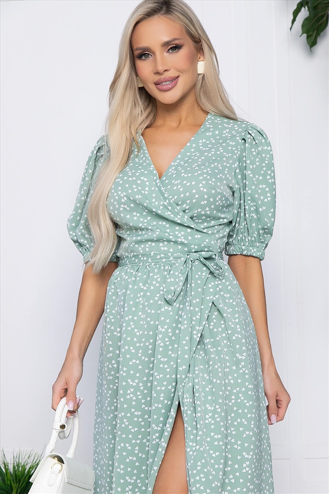 Цвет: оливковый Артикул: П10487.  Тип ткани: синтетическая.  Состав: 95% п/э, 5% эластан. Материал: плательная "Прада".  Цвет: оливковый.  Принт: сердечки.   Длина: миди.  Вид застежки: без застежки. Платье скроено на запах. Силуэт: полуприлегающий.  Карманы: отсутствуют.  Подкладка: отсутствует.  Декоративные элементы: отсутствуют. Длина изделия от шва плеча: 44-52/ 100 см.  Размер изделия на модели: 44. Рост модели: 168 см. Невероятно женственное платье в роскошном оливковом оттенке. В таком платье вы будете выглядеть неповторимо. Пышная юбка делает образ еще более романтическим. Платье скроено на запах, что позволяет комфортно фиксировать его по линии талии. Рукав втачной, укороченный, по низу на резинке. Уход за изделием: ручная стирка до 30 градусов; нельзя отбеливать; отжим запрещён; гладить при t не более 110 С; гладить с изнанки. *Допуск отклонения длины при массовом производстве 1-3 см является нормой.