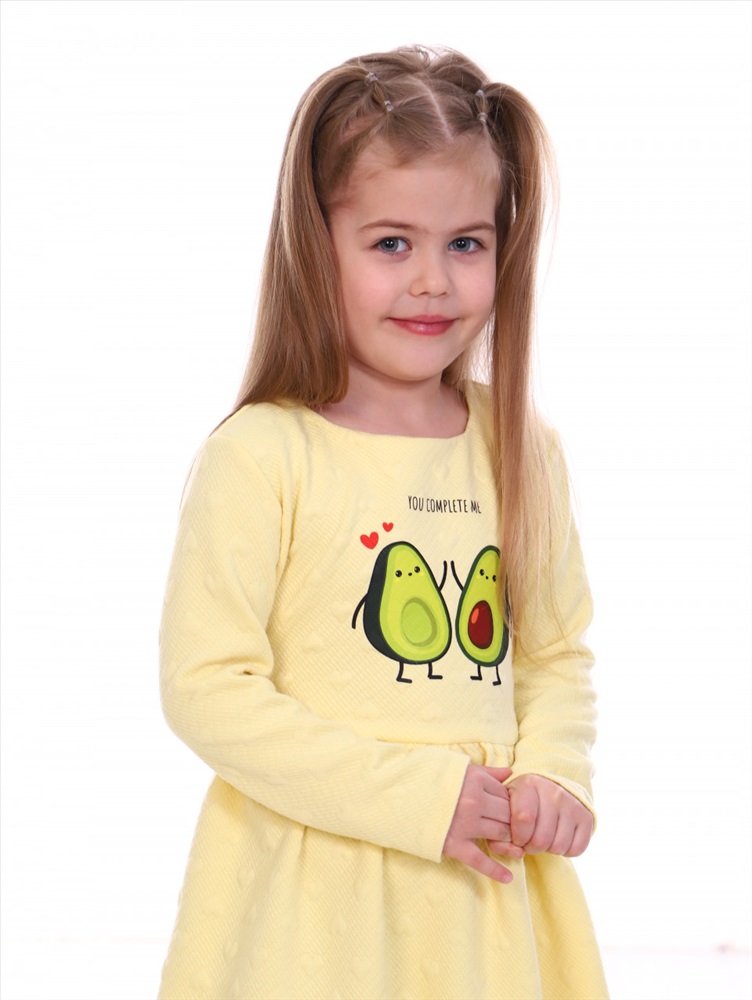 Платье для девочки с длинным рукавом и отрезной юбкой по талии. Горловина округлая, на полочке принт с влюбленными авокадо. Обьем талии можно регулировать сзади завязками. Праздничное платье для девочки простое и стильное. Это и платье на день рождения, детское платье на 8 марта, платье в детский сад или на прогулку.